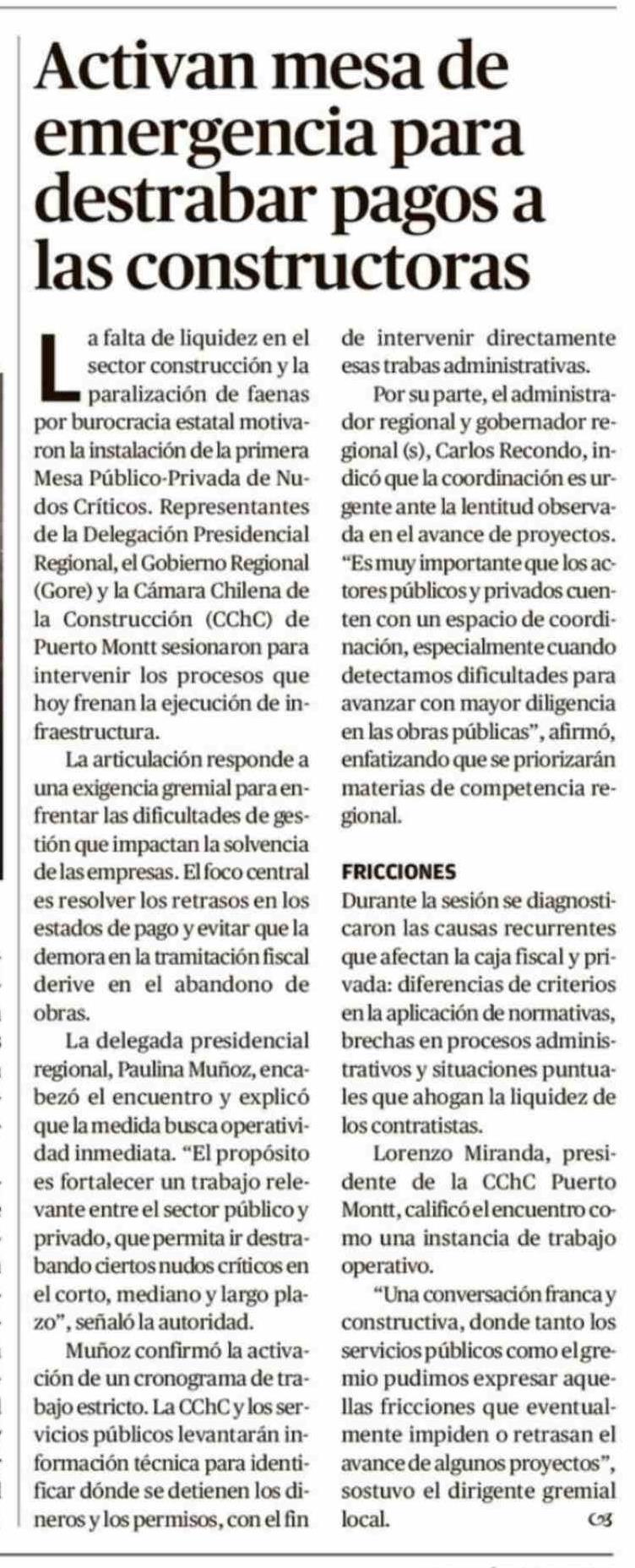 Activan mesa de emergencia para destrabar pagos a las constructoras 19-02-2026 El Llanquihue |