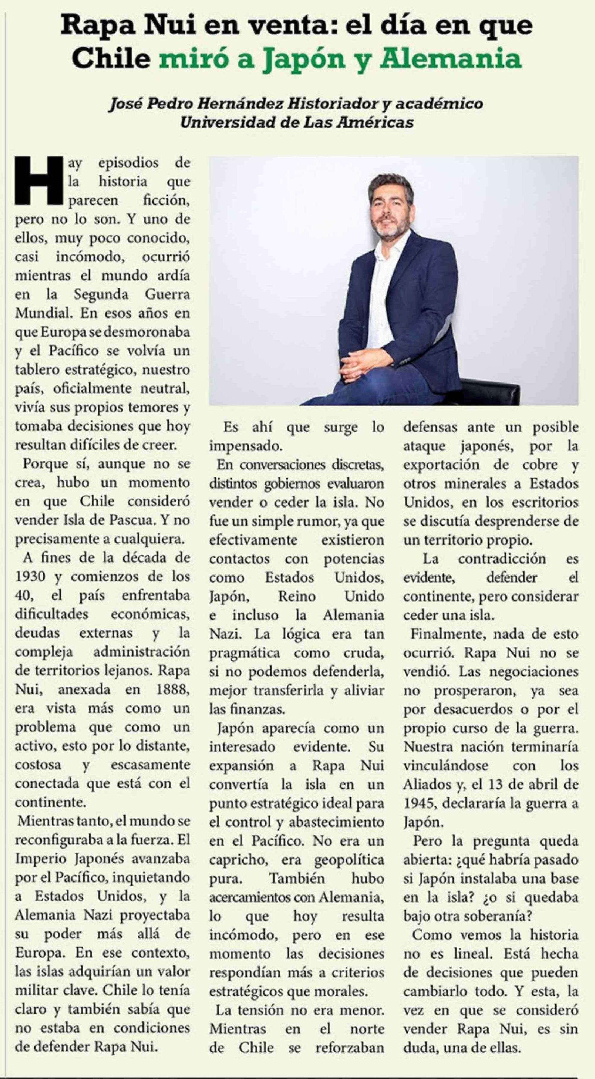 | Título: | Columnas de Opinión: Rapa Nui en venta: el día en que Chile miró a Japón y Alemania |