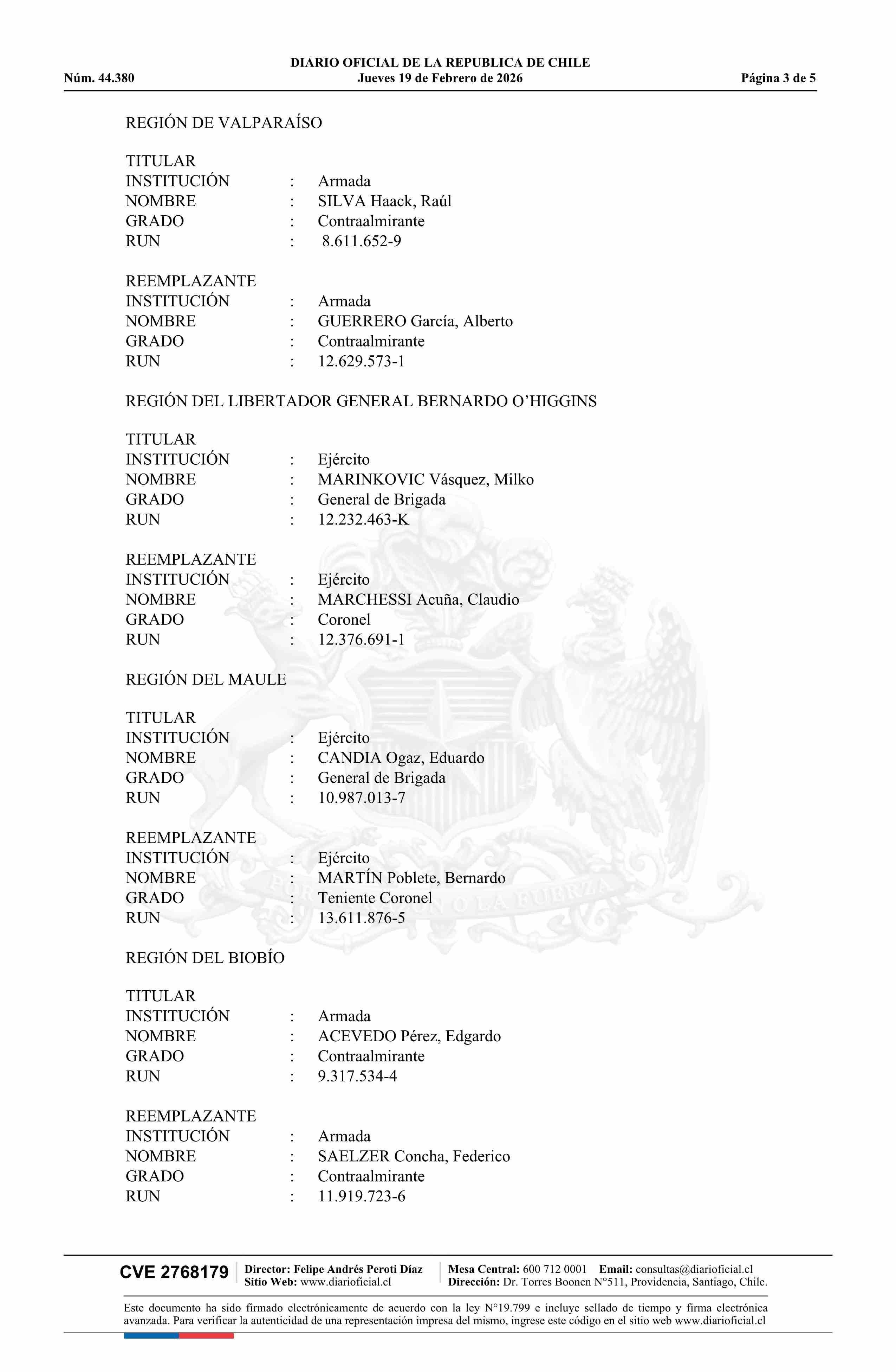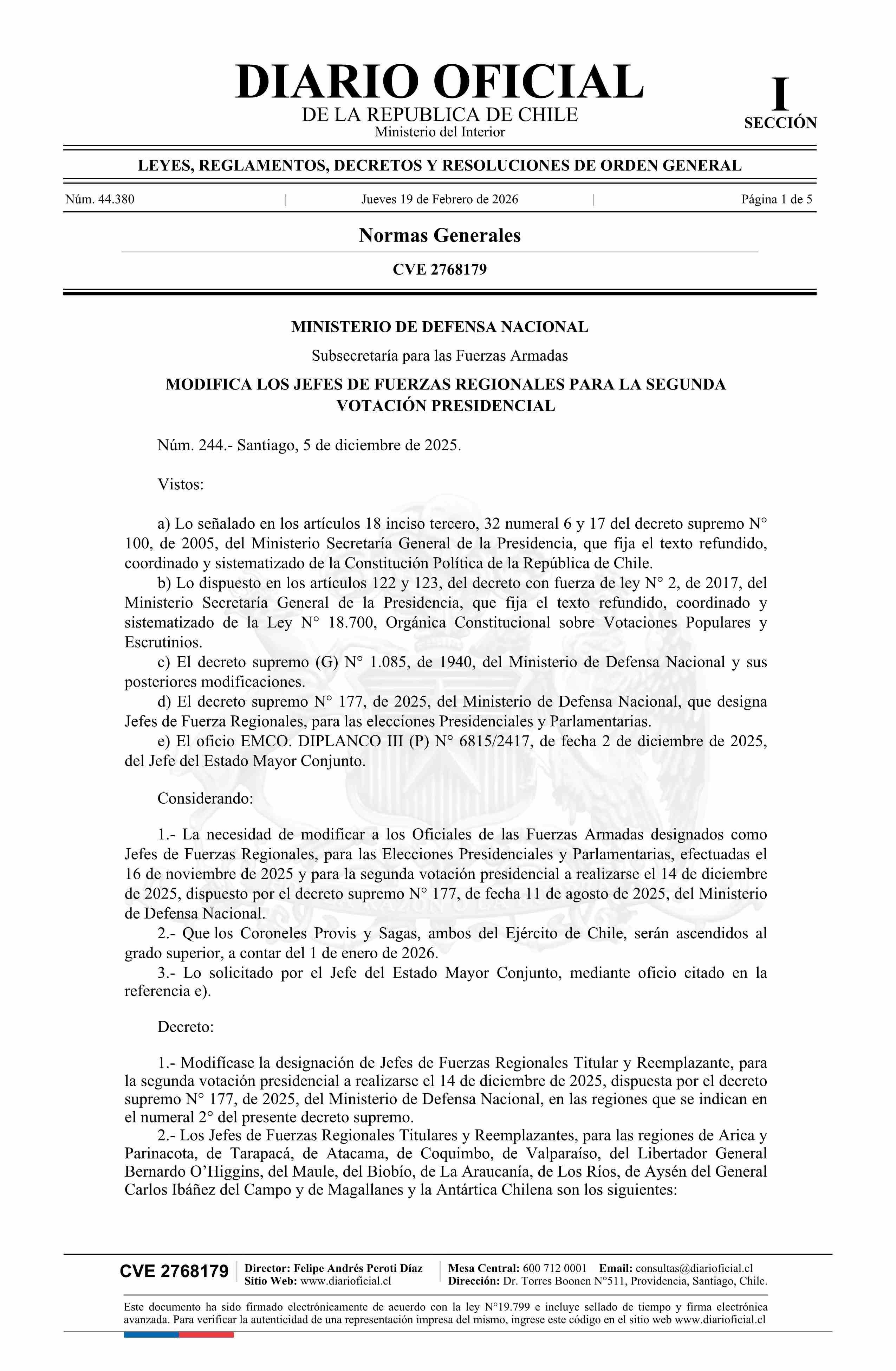 Decreto número 244, de 2025.- Modifica los Jefes de Fuerzas Regionales para la segunda votación presidencial 19-02-2026 Diario Oficial Edición Electrónica |