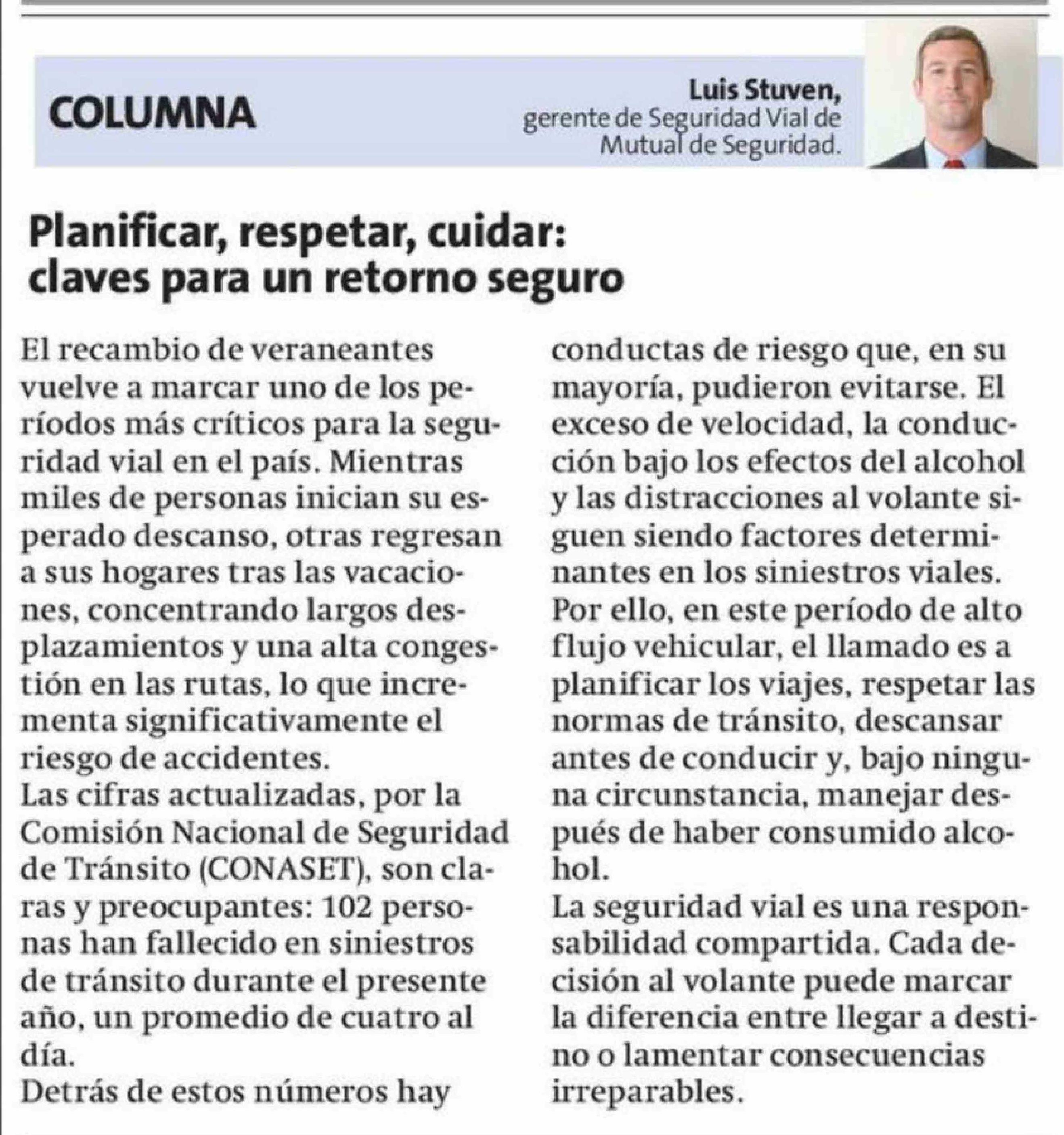 Columnas de Opinión: Planificar, respetar, cuidar: claves para un retorno seguro 02-02-2026 La Estrella de Concepción |
