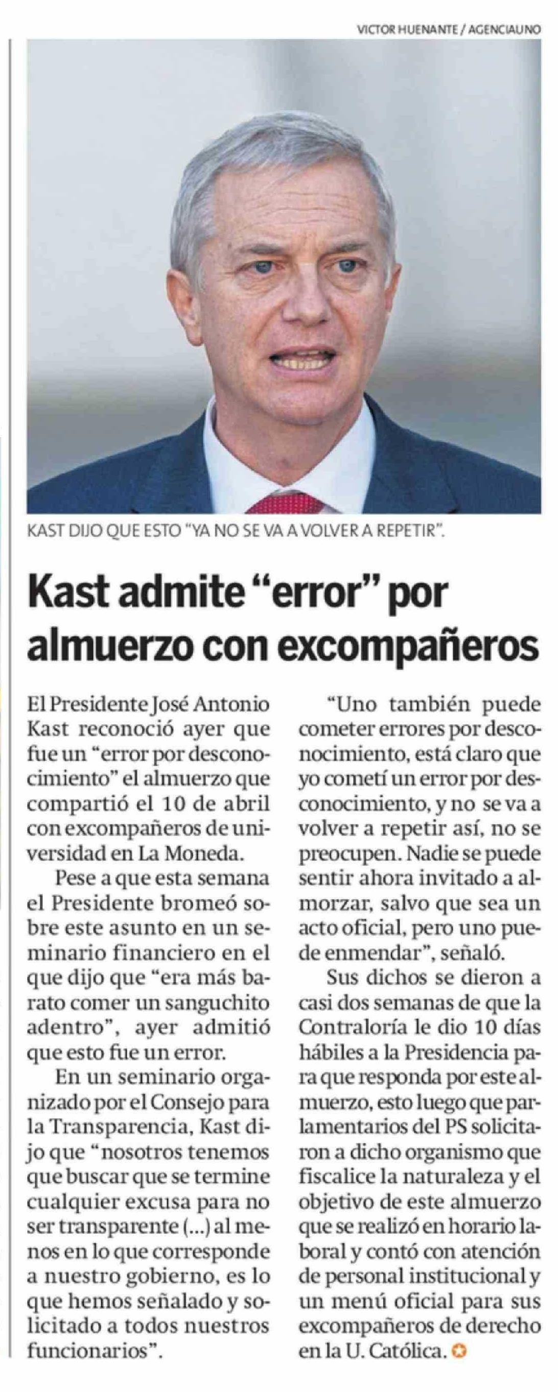 | Título: | Kast admite "error" por almuerzo con excompañeros |