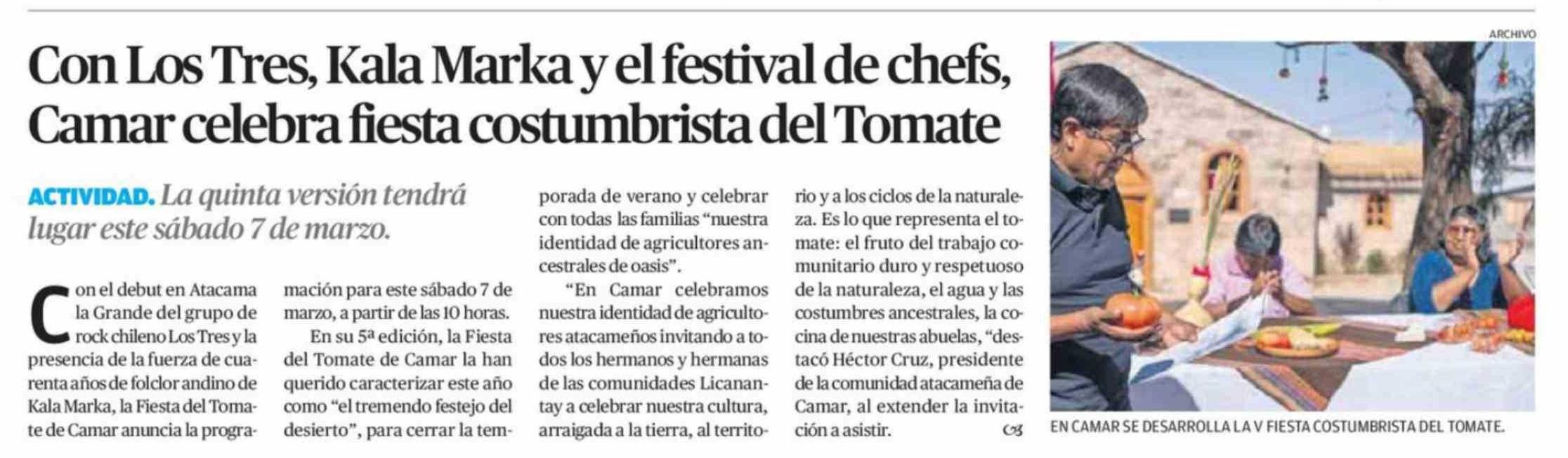 Con Los Tres, Kala Marka y el festival de chefs, Camar celebra fiesta costumbrista del Tomate 04-03-2026 El Mercurio de Calama |