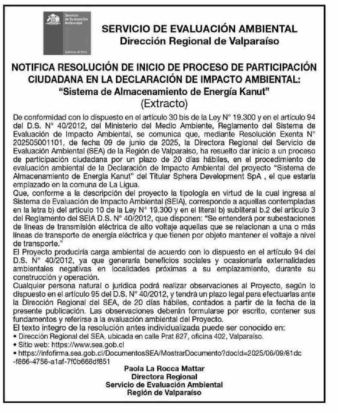 EXTRACTOS: SERVICIO DE EVALUACIÓN AMBIENTAL Dirección Regional de Valparaíso 18-06-2025 La Estrella de Valparaíso |