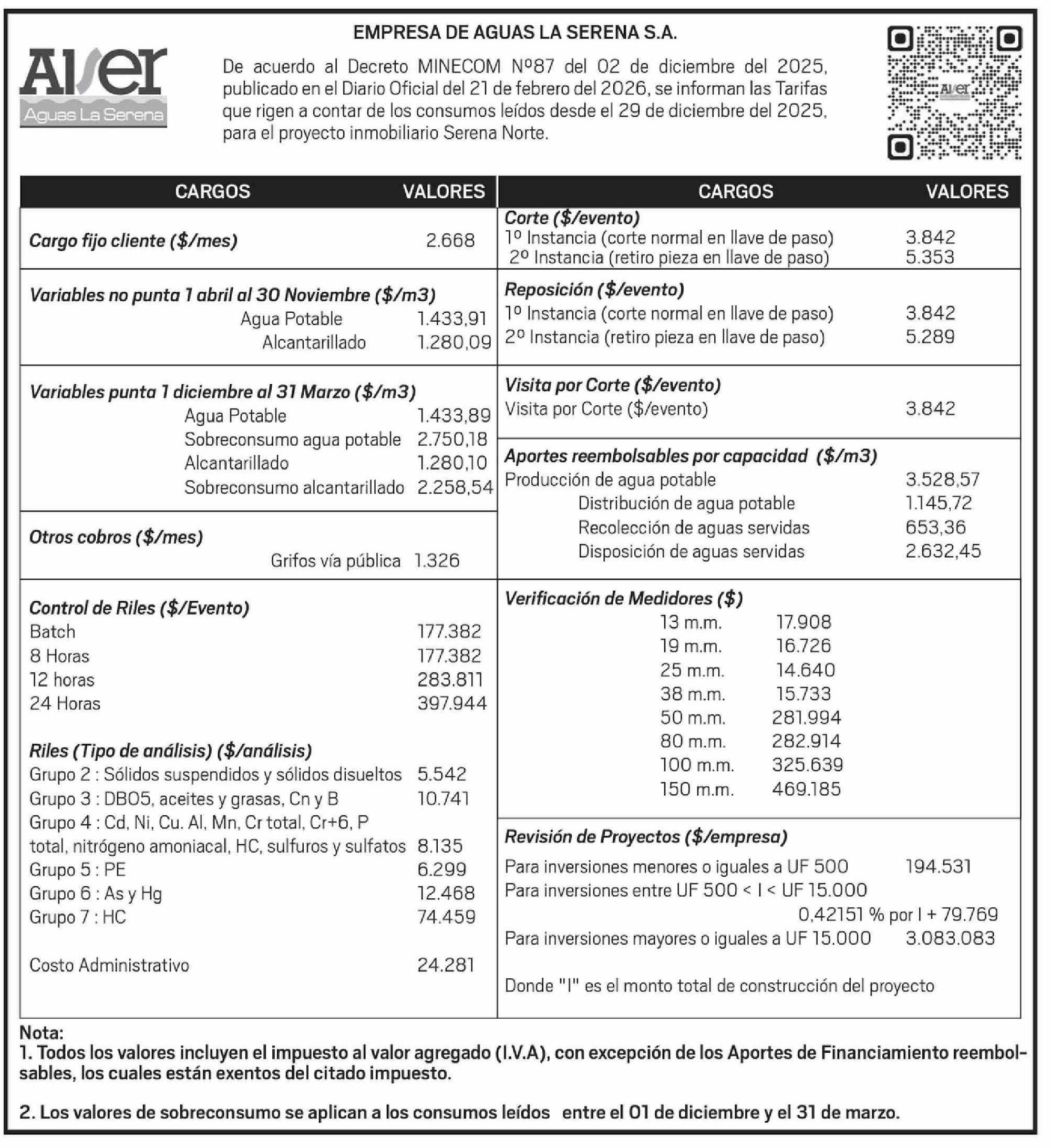 | Título: | Extractos: EMPRESA DE AGUAS LA SERENA S.A. De acuerdo al Decreto MINECOM Nº87 del 02 de diciembre del 2025, publicado en el Diario Oficial del 21 de febrero del 2026, se informan las Tarifas que rigen a contar de los consumos leídos desde el 29 de diciembre del 2025, para el proyecto inmobiliario Se |