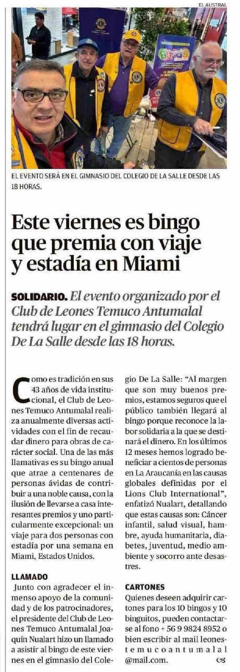 Este viernes es bingo que premia con viaje y estadía en Miami 28-05-2025 El Austral de la Araucanía |