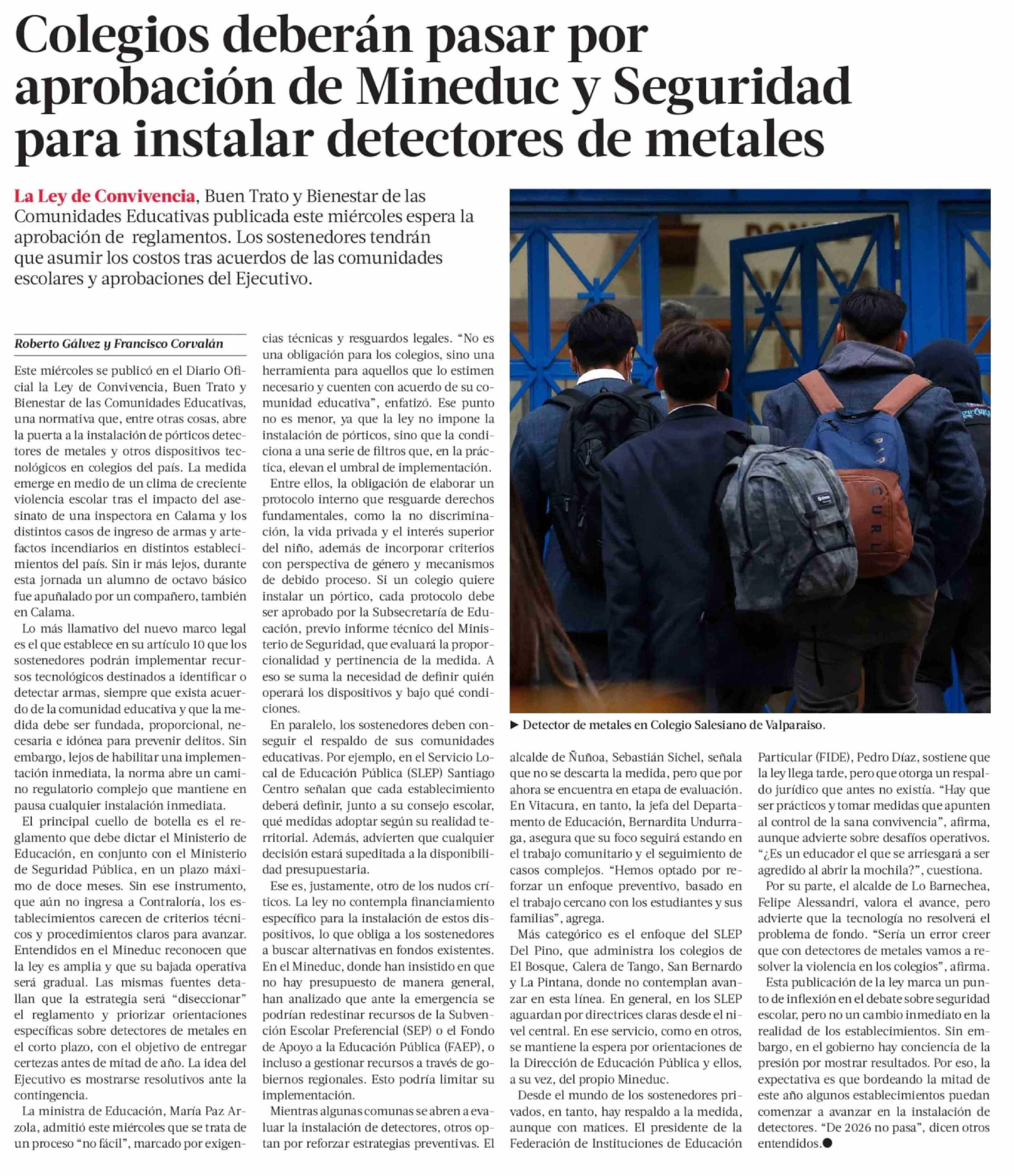 Colegios deberán pasar por aprobación de Mineduc y Seguridad para instalar detectores de metales 02-04-2026 La Tercera |