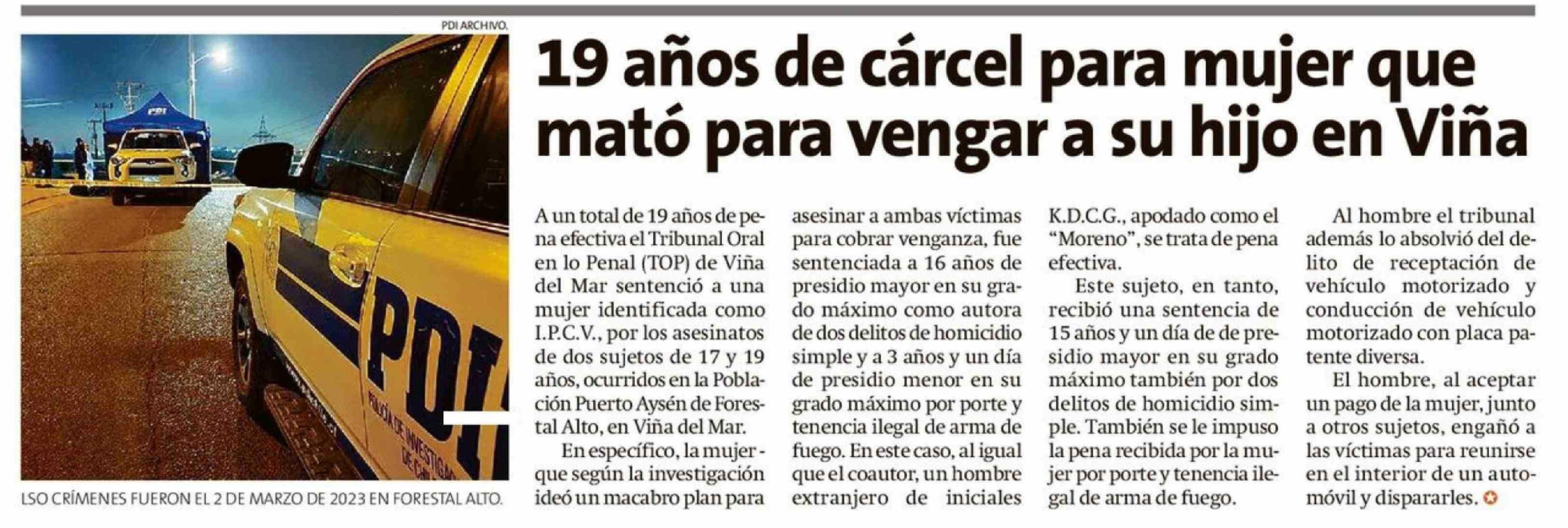| Título: | 19 Años de cárcel para mujer que mató para vengar a su hijo en Viña |