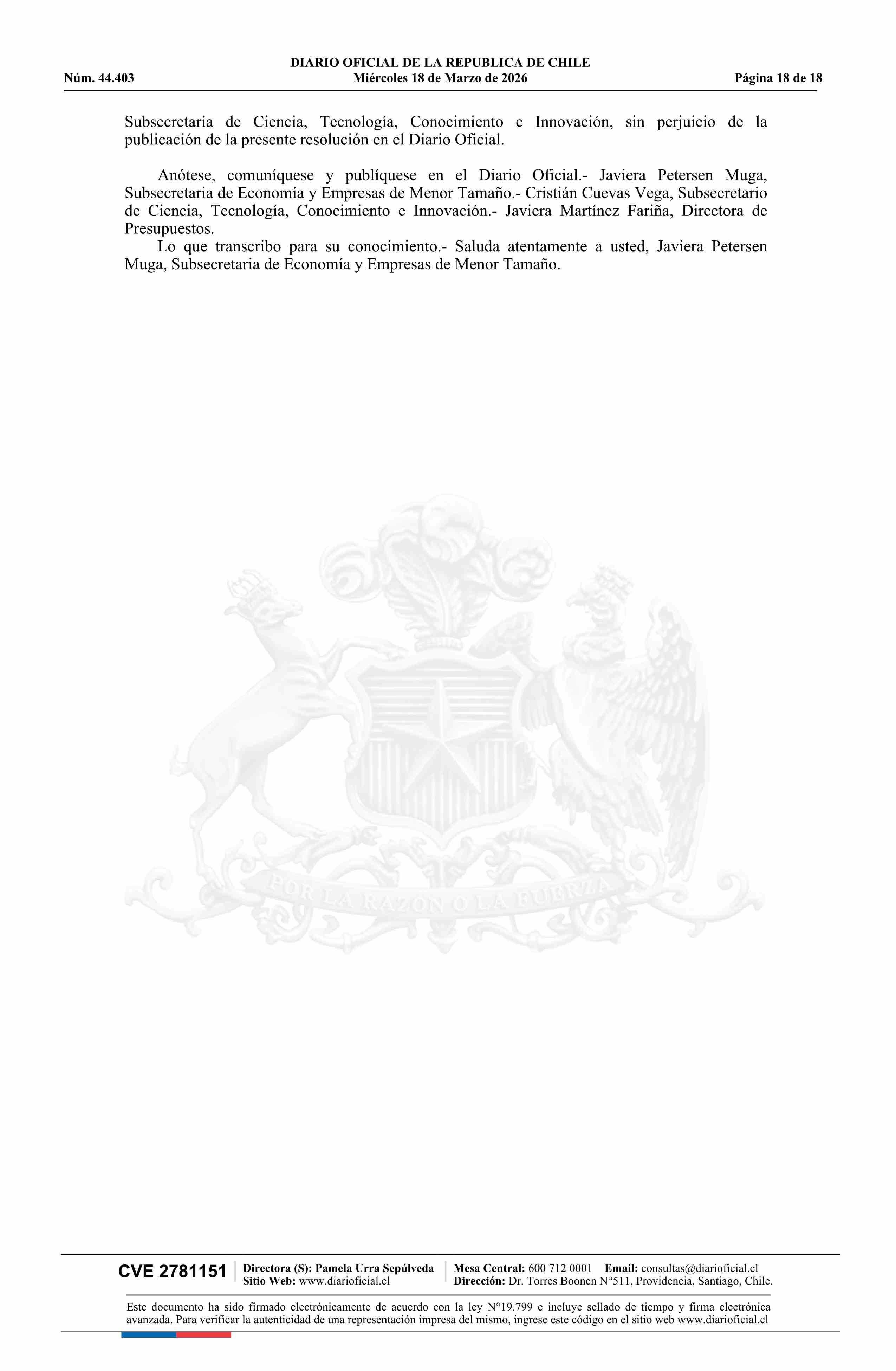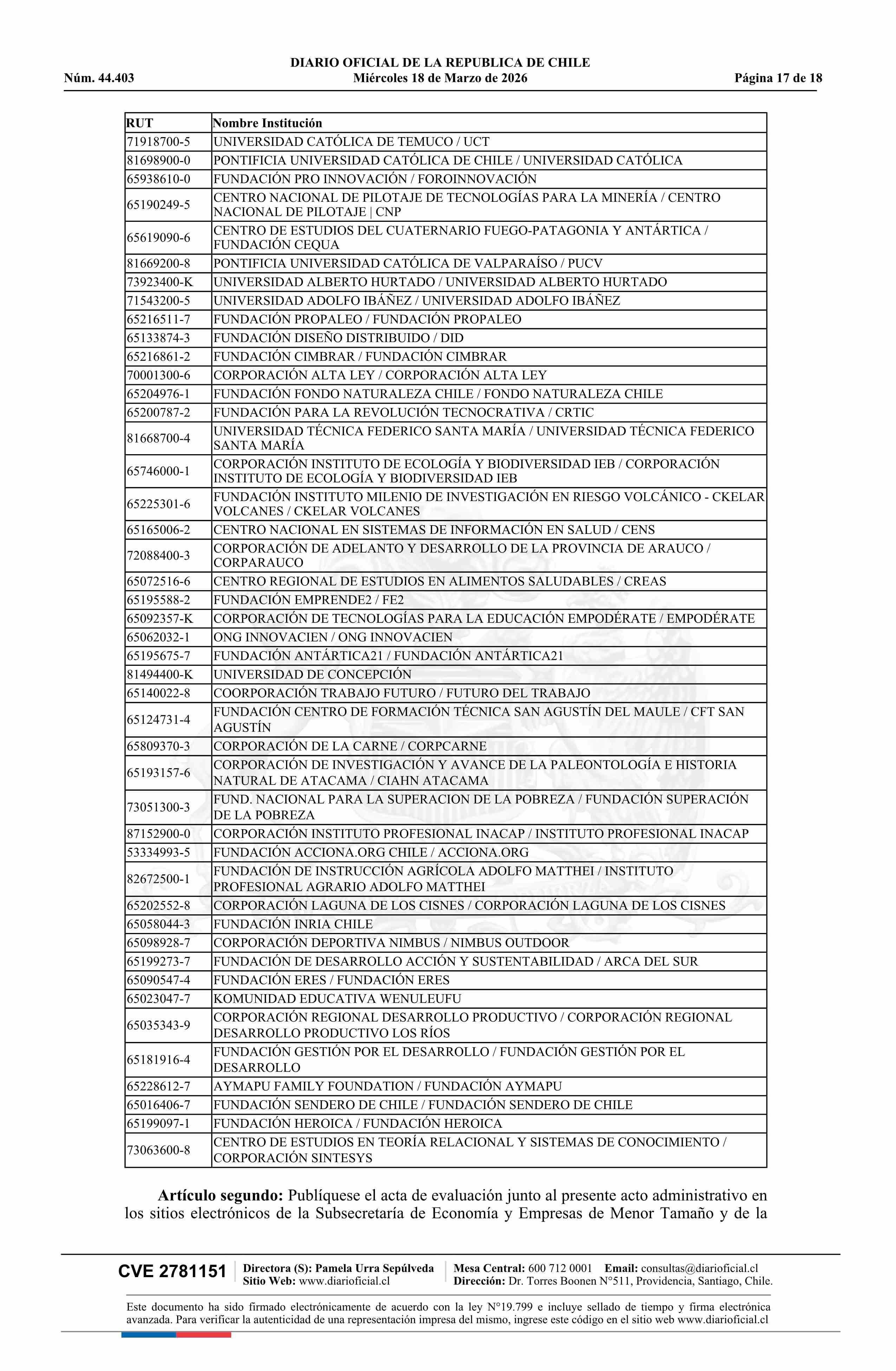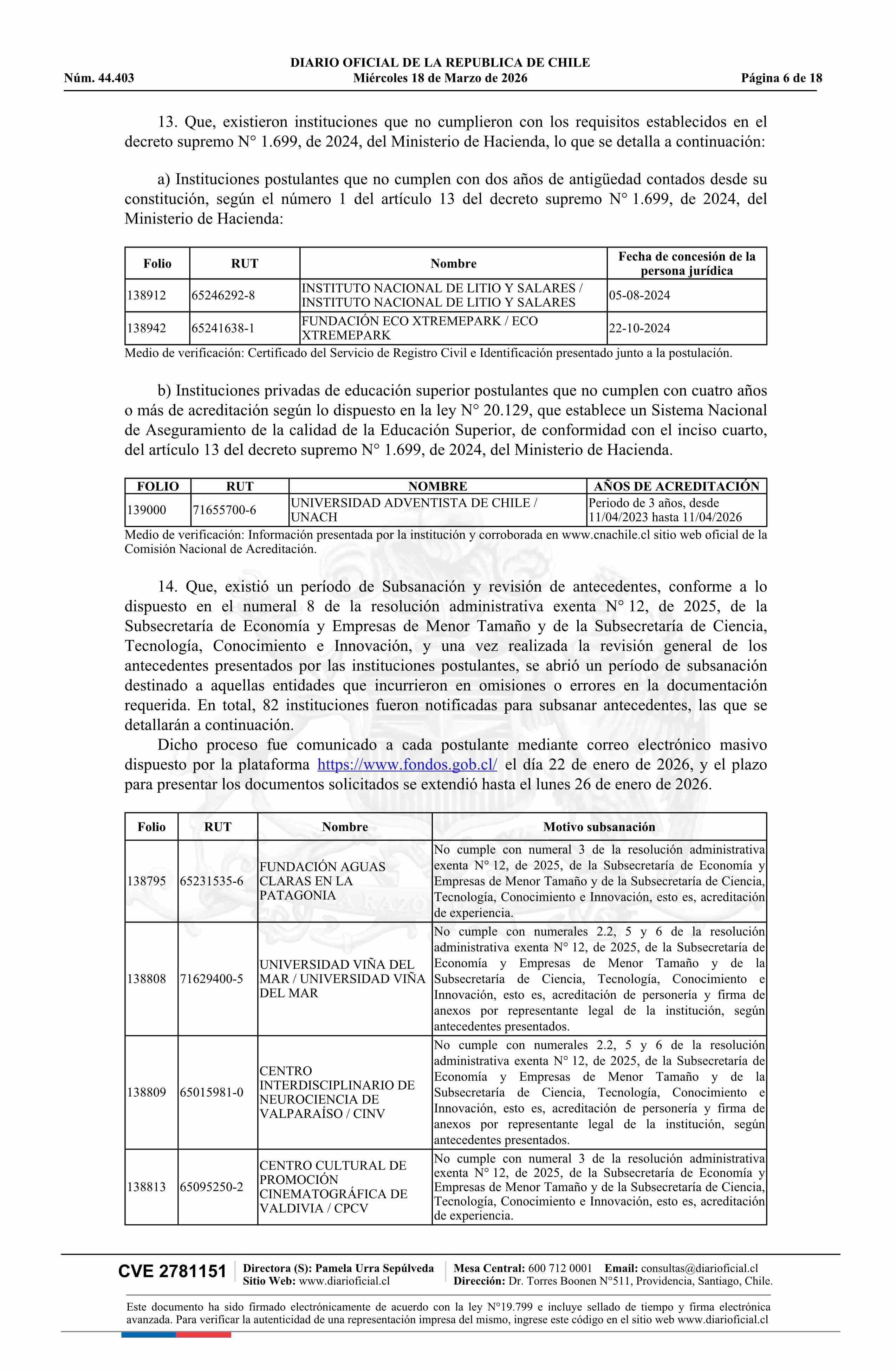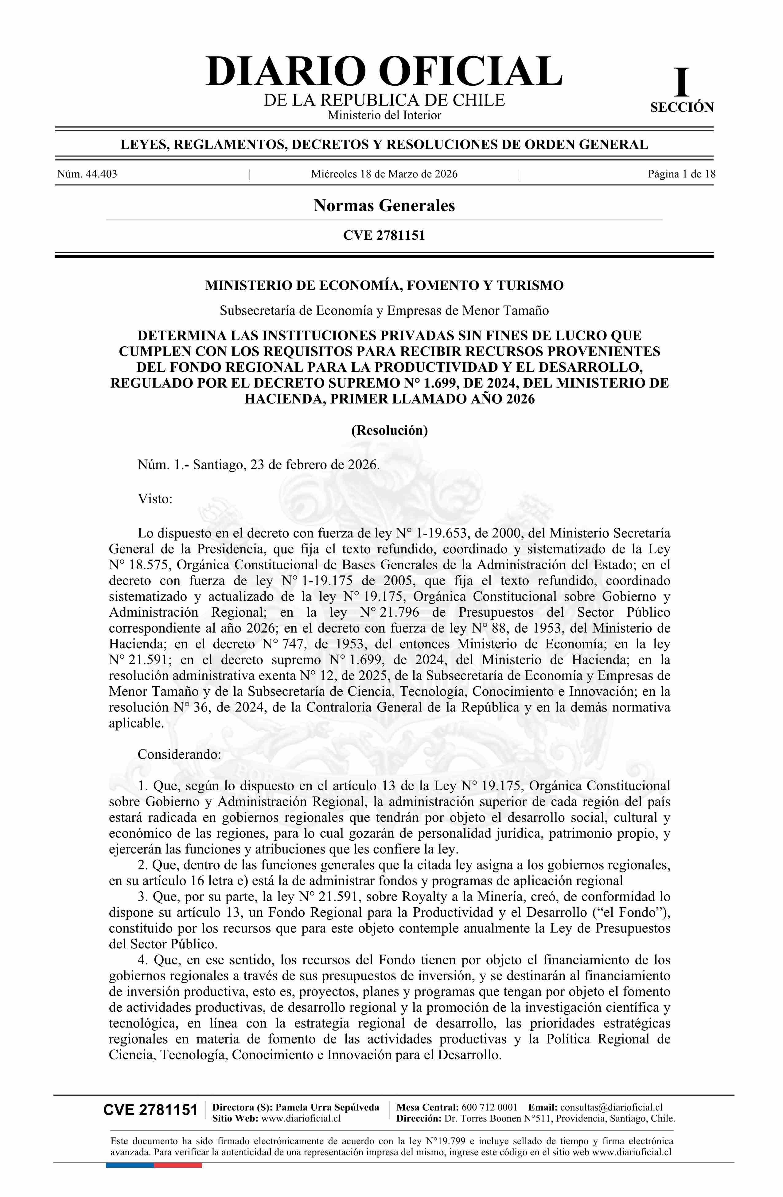 | Título: | Resolución exenta número 1, de 2026.- Determina las instituciones privadas sin fines de lucro que cumplen con los requisitos para recibir recursos provenientes del Fondo Regional para la Productividad y el Desarrollo, regulado por el decreto N° 1.699, de 2024, del Ministerio de Hacienda, Primer Llam |