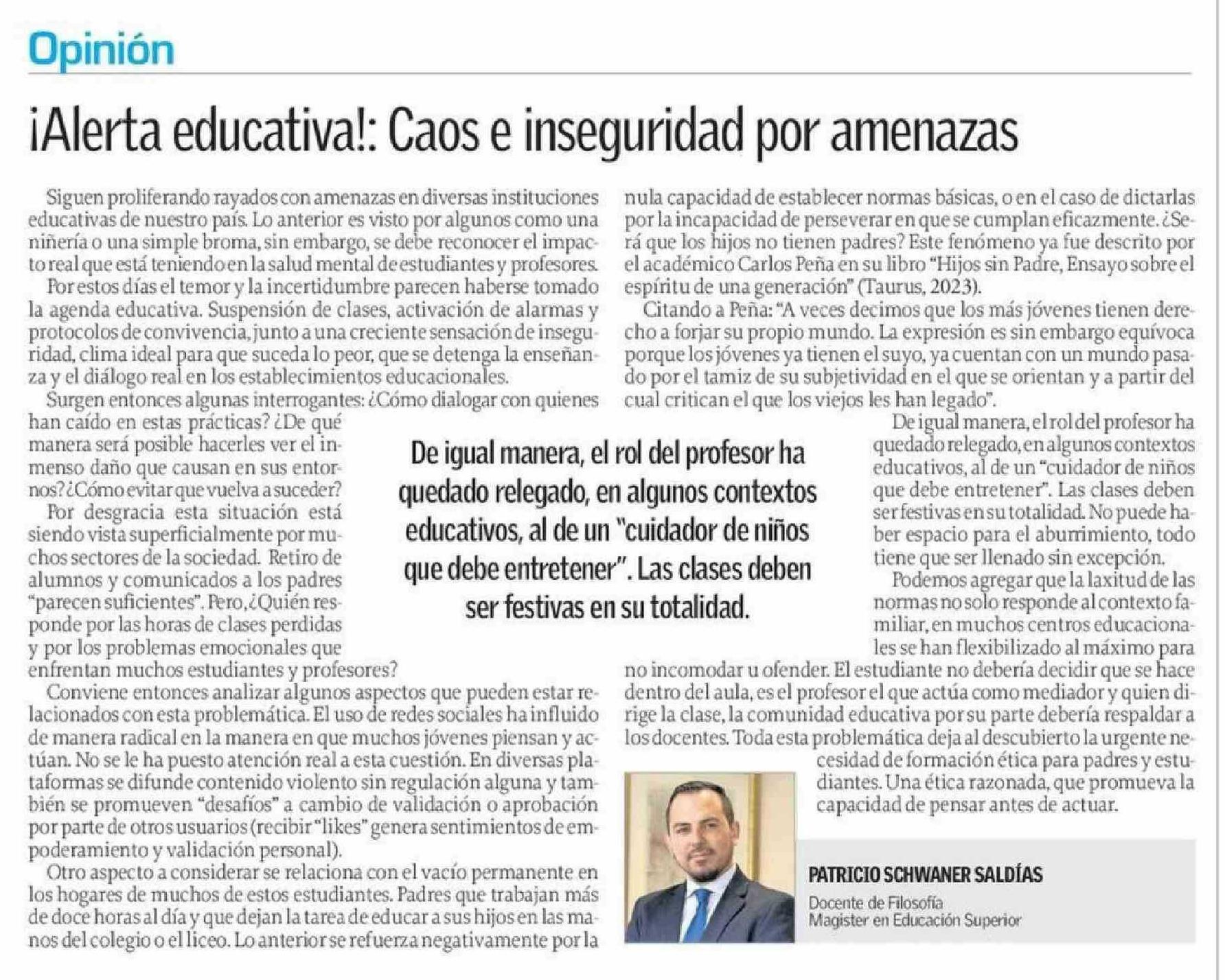 | Título: | Columnas de Opinión: ¡Alerta educativa !: Caos e inseguridad por amenazas |