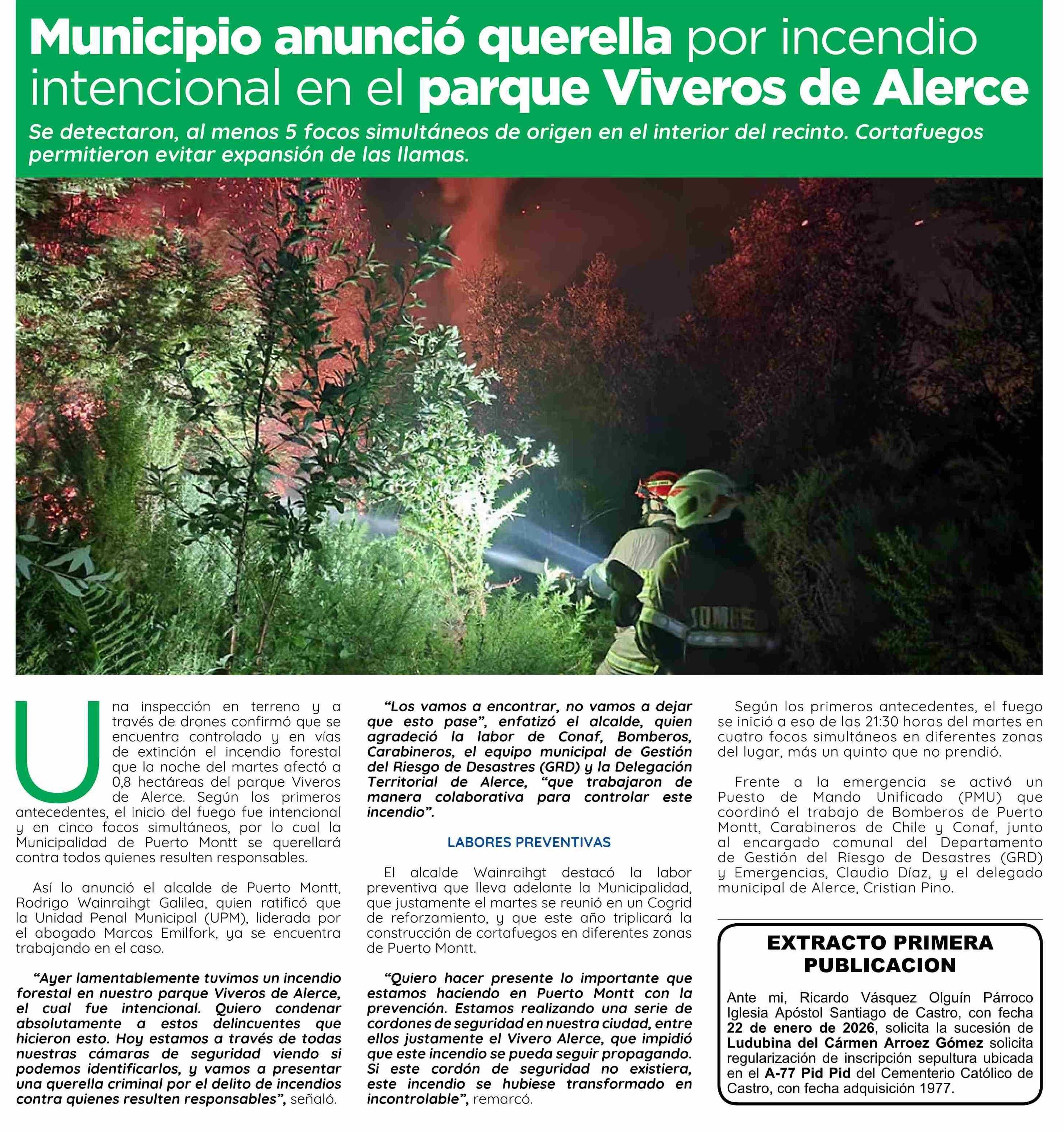 Municipio anunció querella por incendio intencional en el parque Viveros de Alerce 22-01-2026 El Insular |