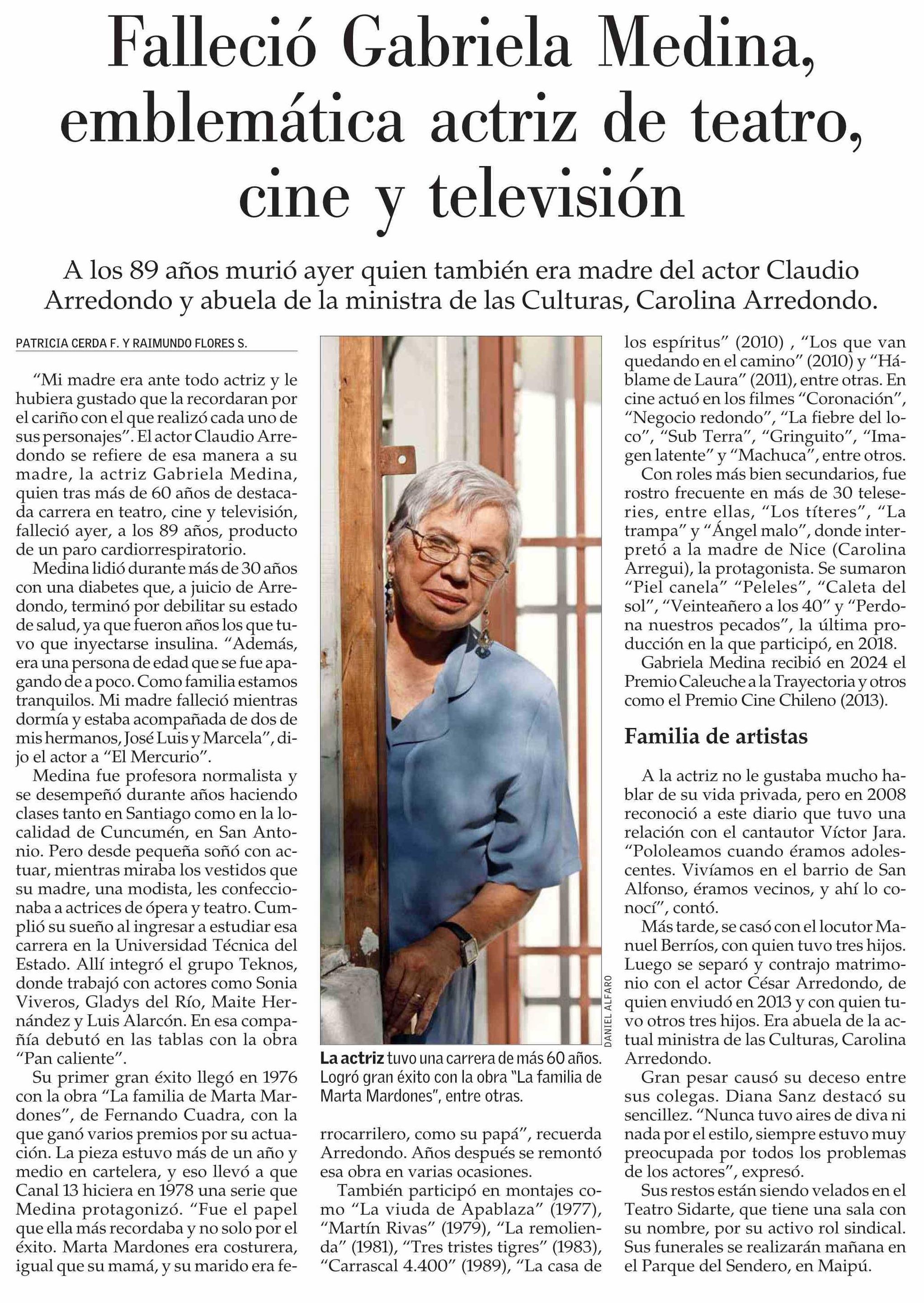 Falleció Gabriela Medina, emblemática actriz de teatro, cine y televisión 17-06-2025 El Mercurio |