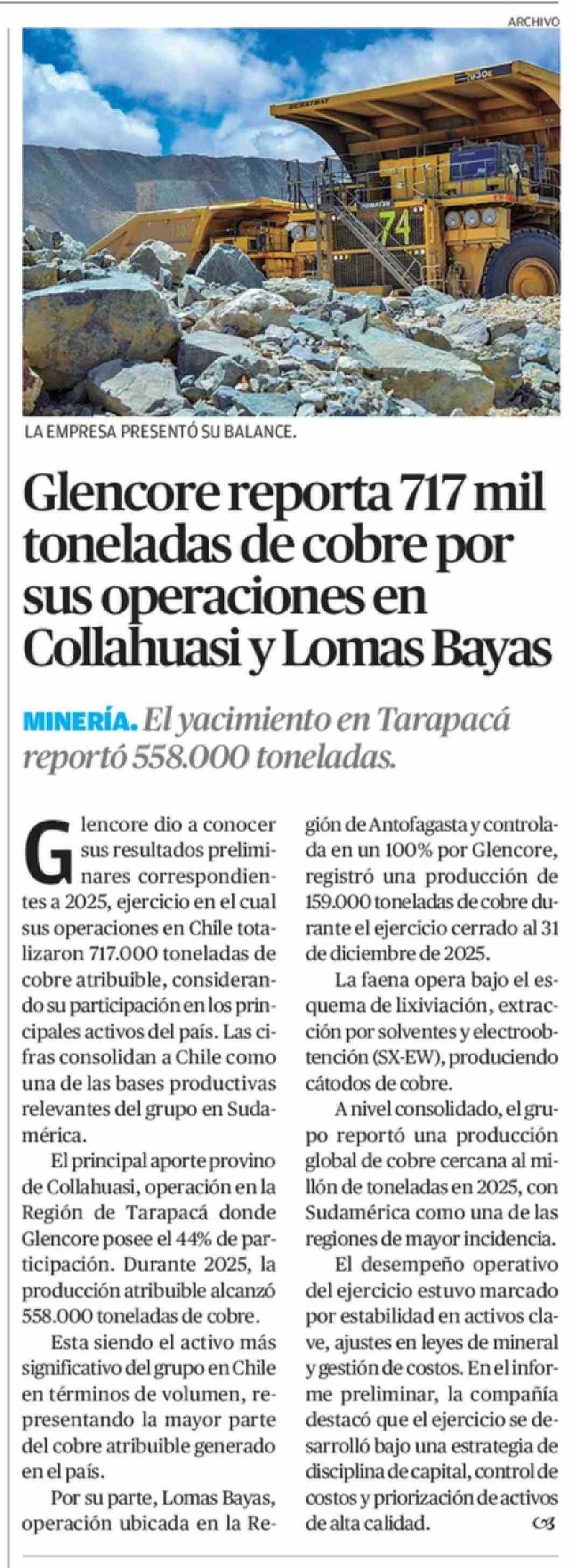 Glencore reporta 717 mil toneladas de cobre por sus operaciones en Collahuasi y Lomas Bayas 20-02-2026 El Mercurio de Antofagasta |