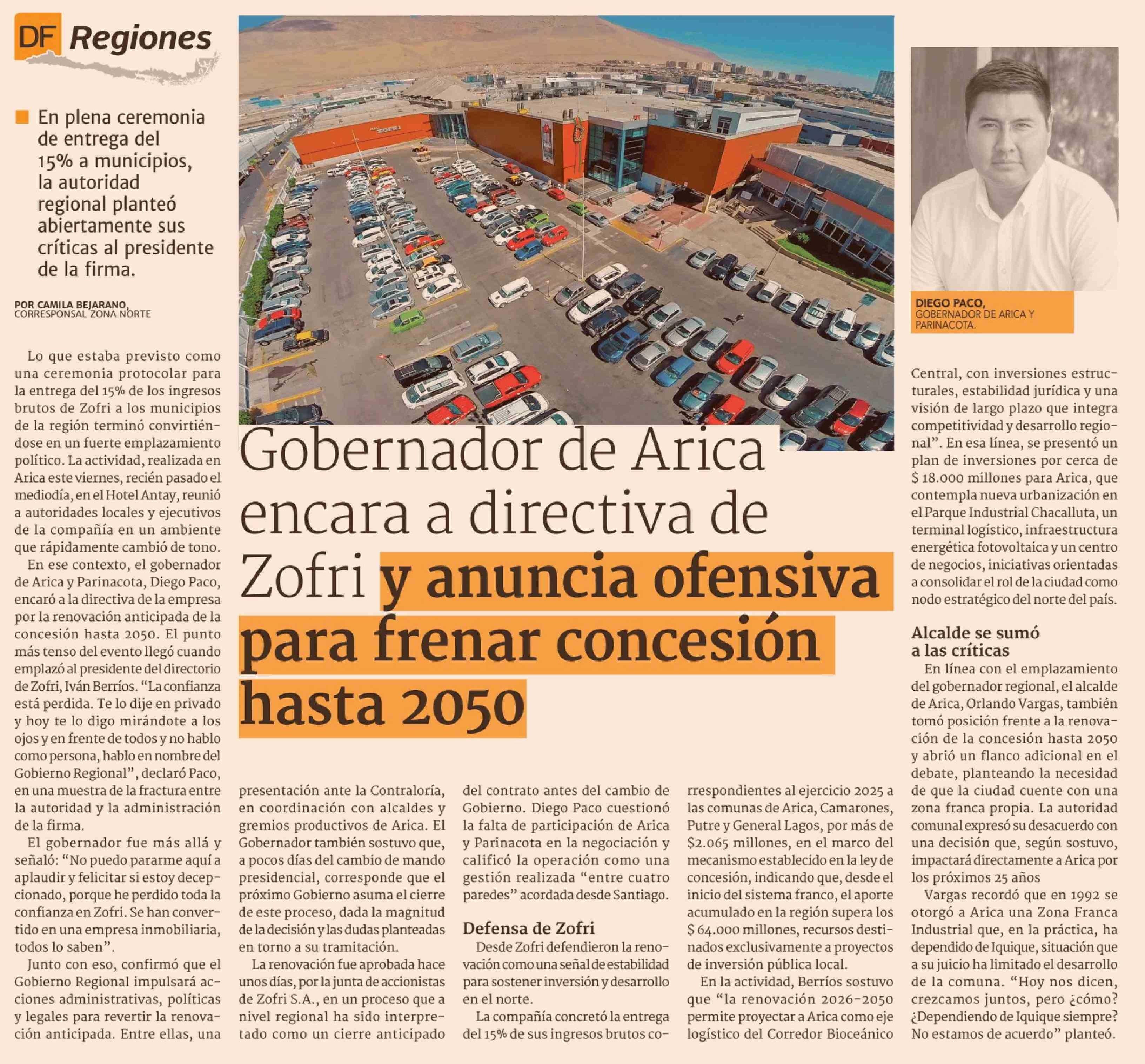 Gobernador de Arica encara a directiva de Zofri y anuncia ofensiva para frenar concesión hasta 2050 24-02-2026 Diario Financiero |