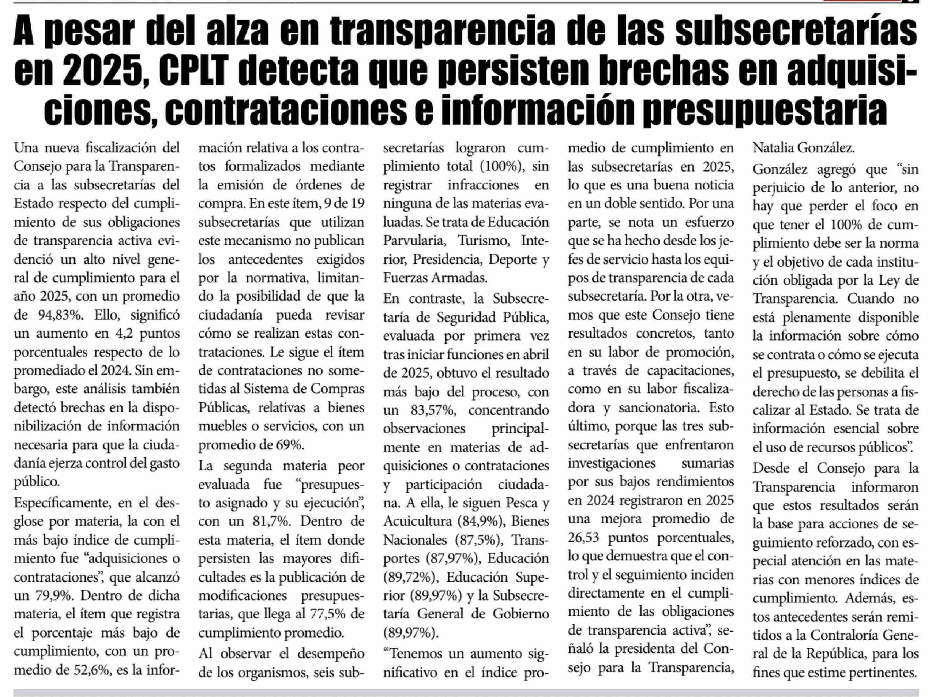 | Título: | A pesar del alza en transparencia de las subsecretarías en 2025, CPLT detecta que persisten brechas en adquisiciones, contrataciones e información presupuestaria |
