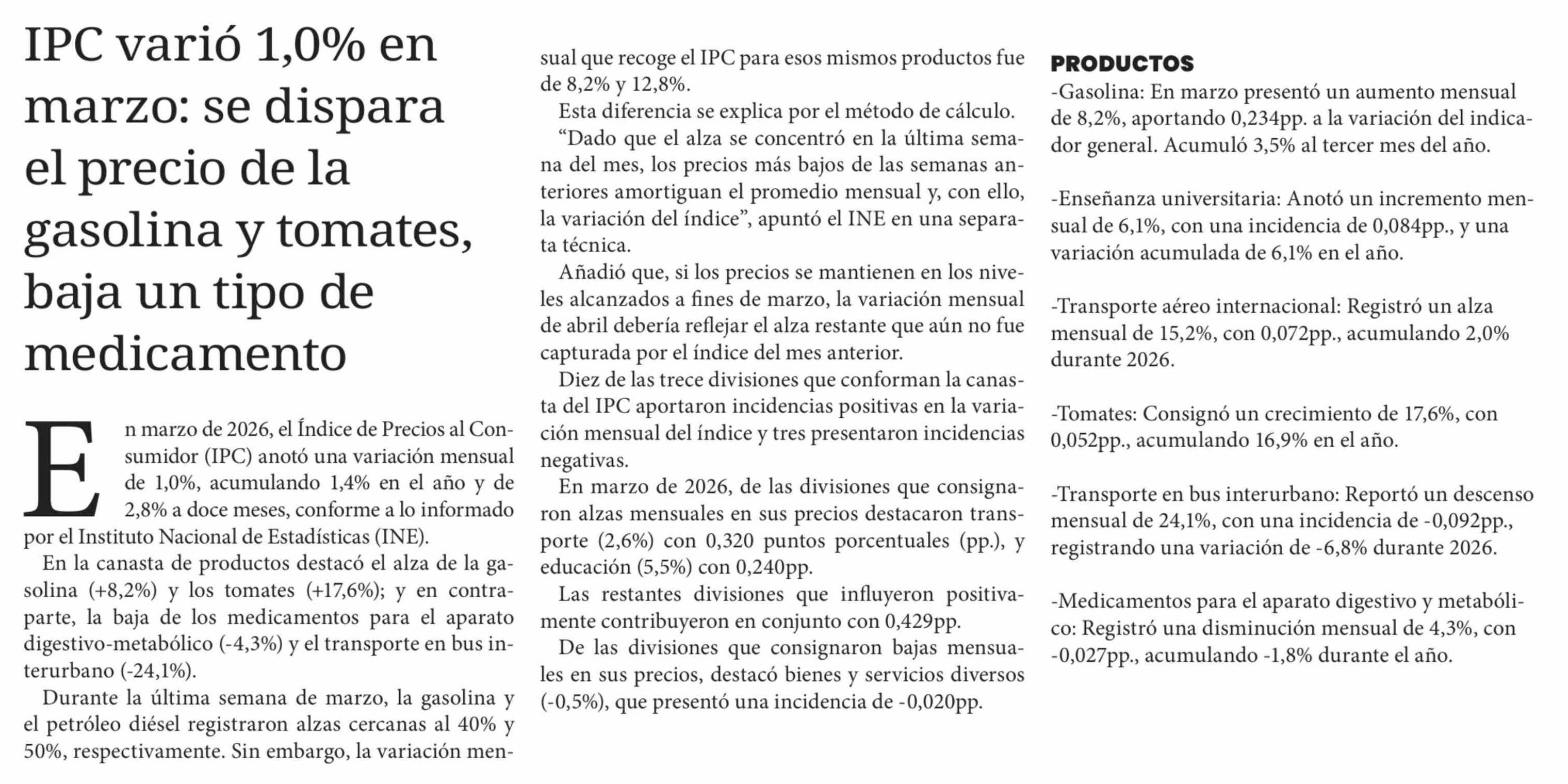 IPC varió 1,0% en marzo: se dispara el precio de la gasolina y tomates, baja un tipo de medicamento 09-04-2026 Diario Chañarcillo |