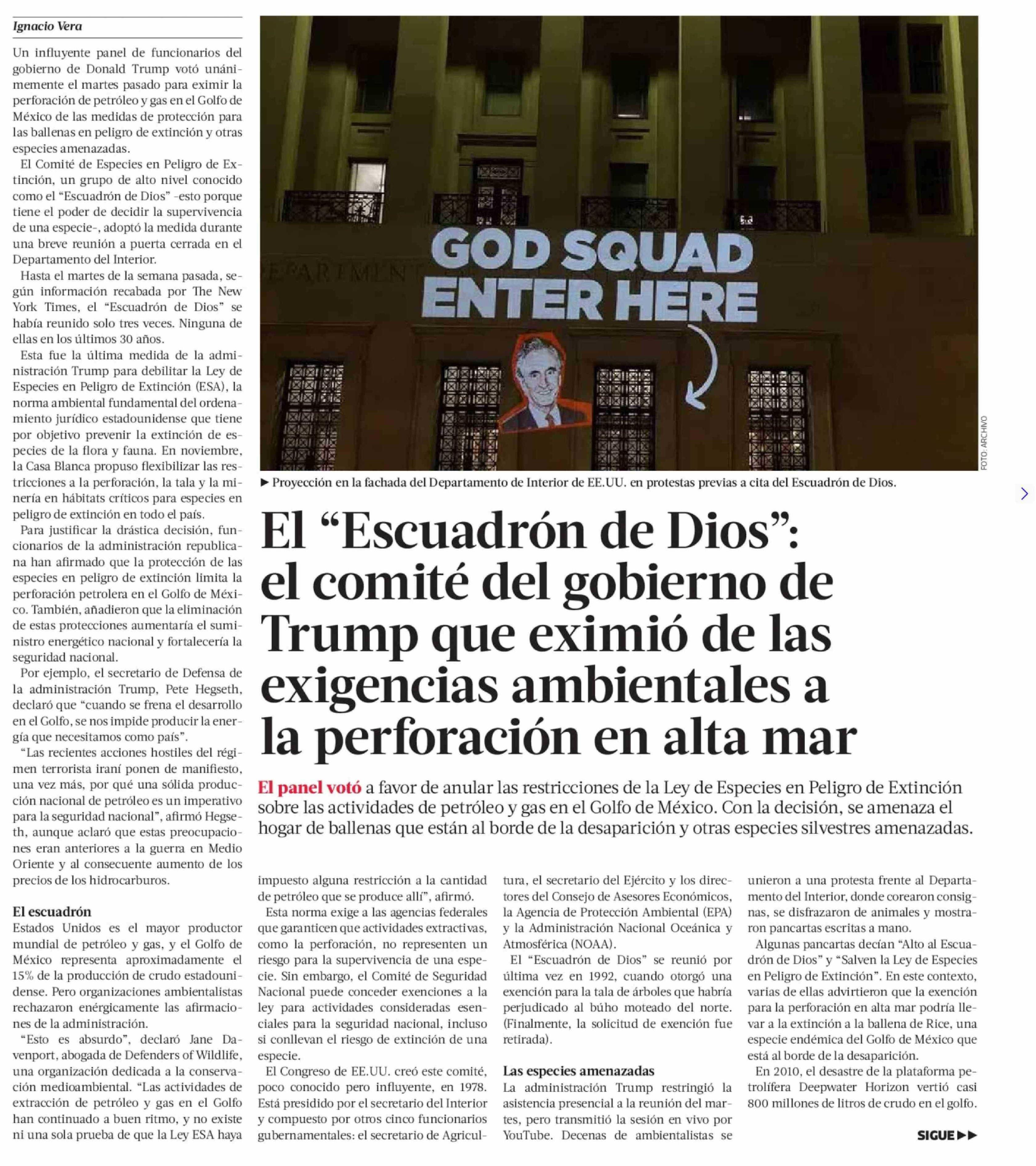 Título: El "Escuadrón de Dios": el comité del gobierno de Trump que eximió de las exigencias ambientales a la perforación en alta mar