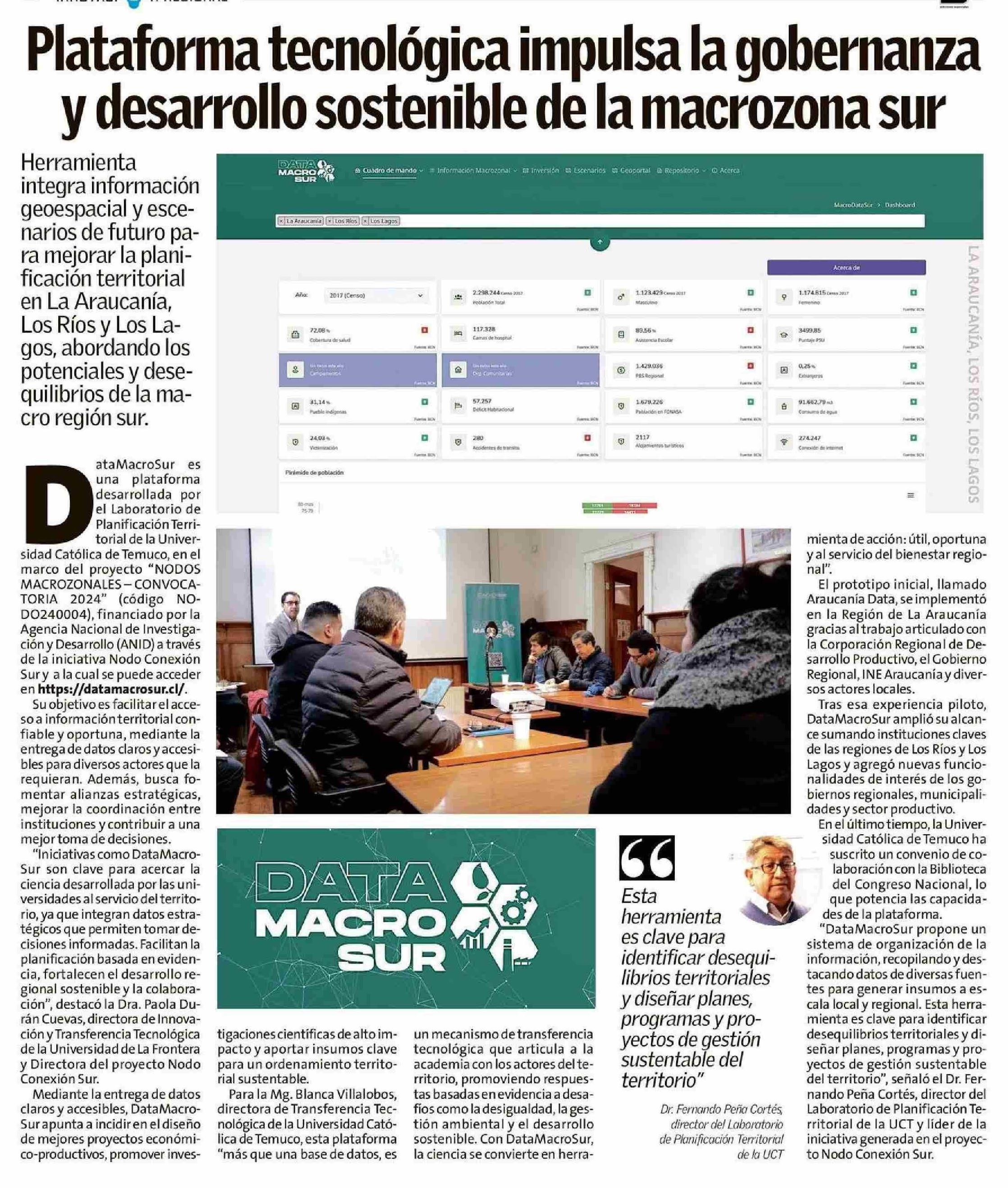 Plataforma tecnológica impulsa la gobernanza y desarrollo sostenible de la macrozona sur 22-06-2025 Diario Austral Región de Los Ríos |