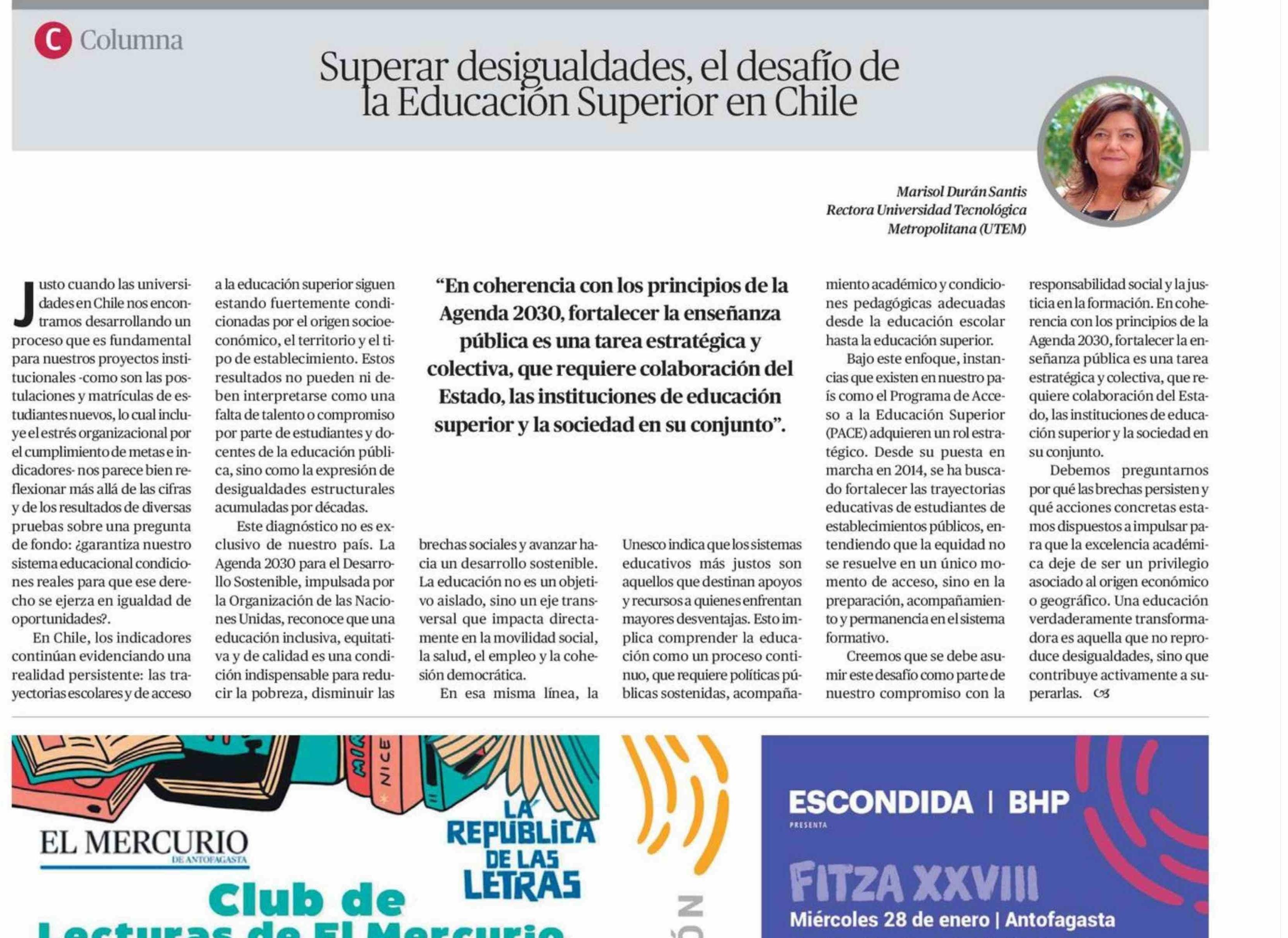 Superar desigualdades, el desafío de a Educación Superior en Chile 28-01-2026 El Mercurio de Antofagasta |