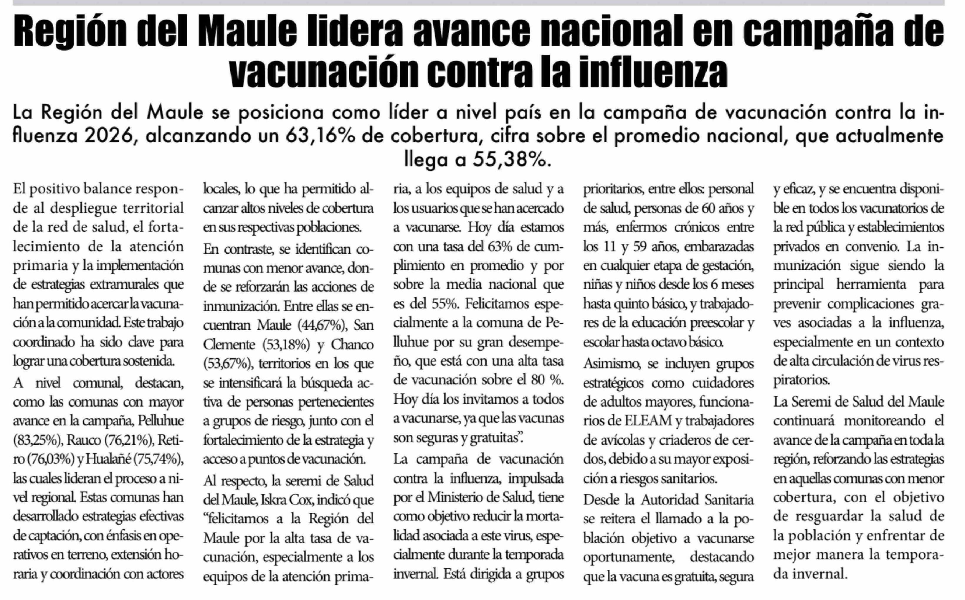 Título: Región del Maule lidera avance nacional en campaña de vacunación contra la influenza