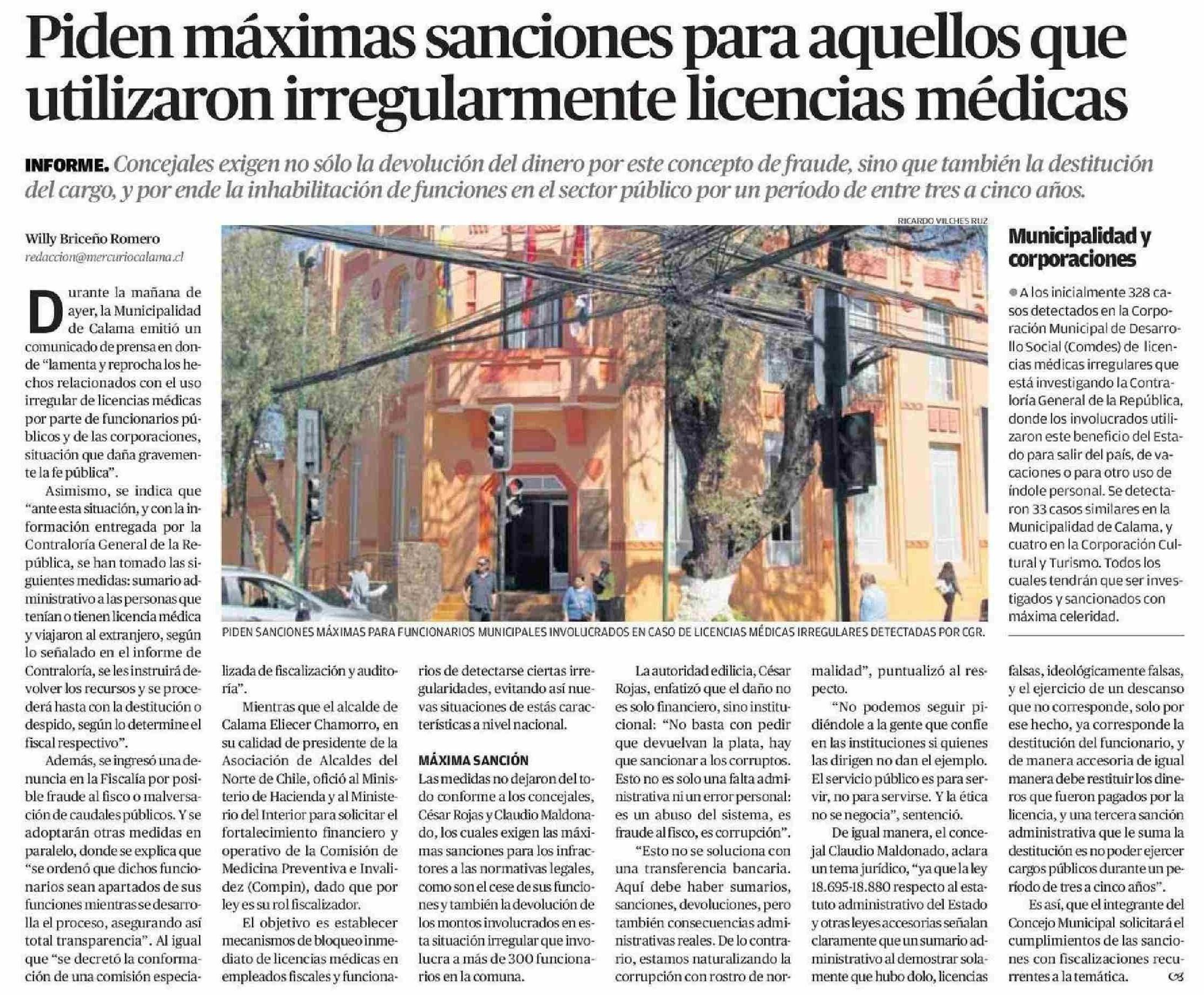 Piden máximas sanciones para aquellos que utilizaron irregularmente licencias médicas 27-05-2025 El Mercurio de Calama |