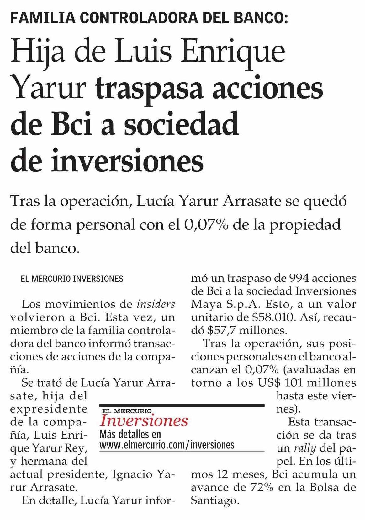 | Título: | Hija de Luis Enrique Yarur traspasa acciones de Bci a sociedad de inversiones |