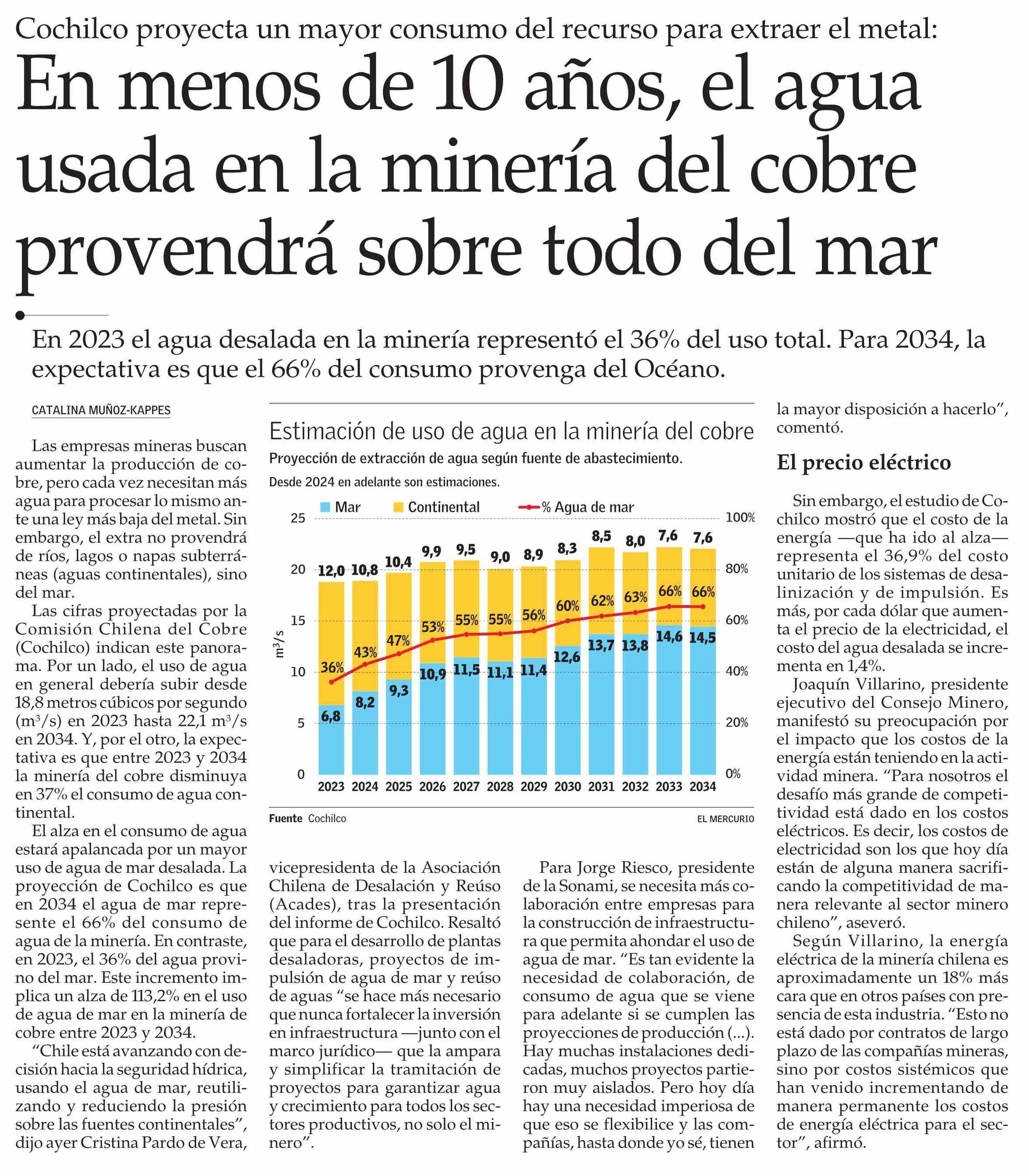 En menos de 10 años, el agua usada en la minería del cobre provendrá sobre todo del mar 12-06-2025 El Mercurio |