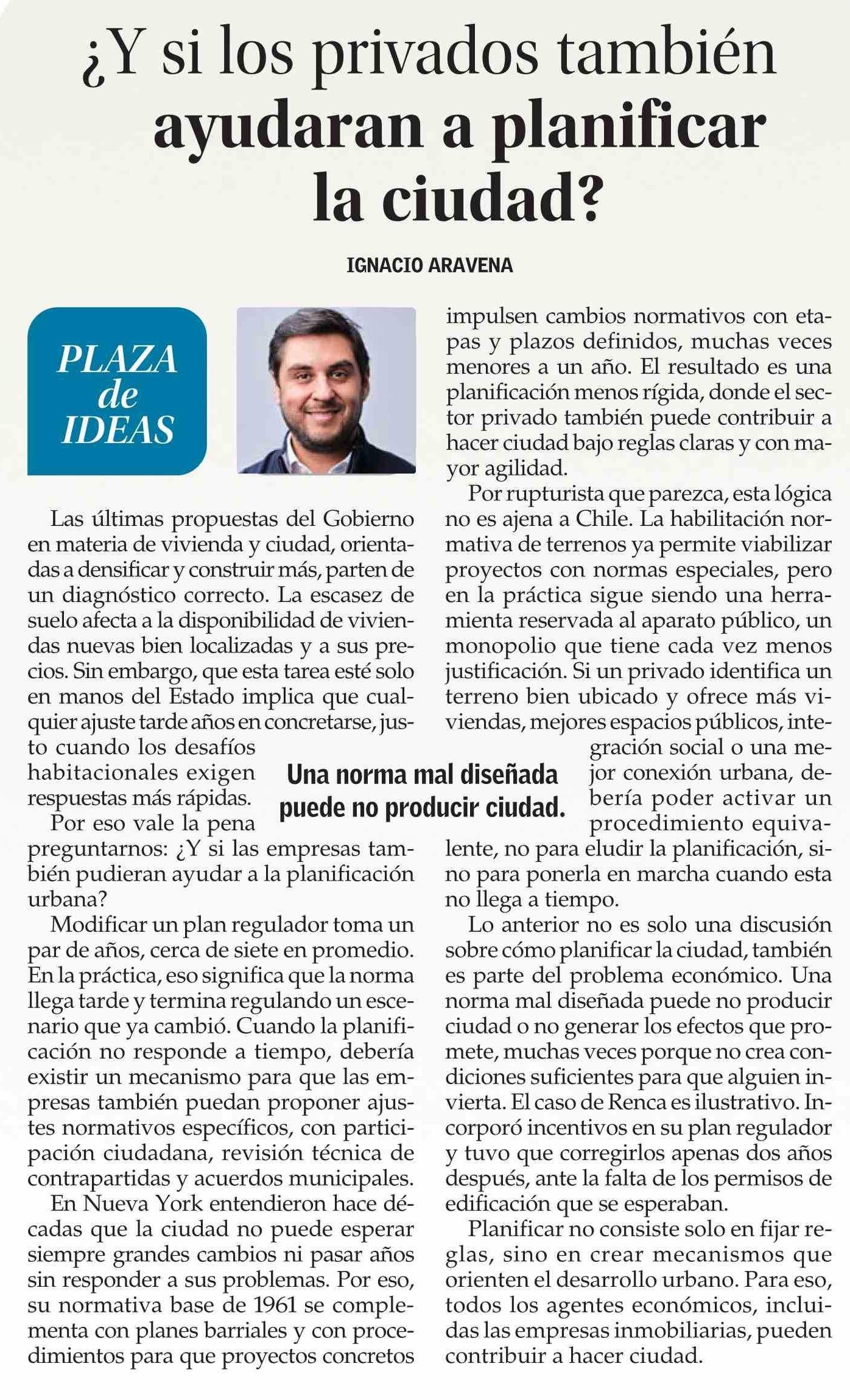 Columnas de Opinión: ¿Y si los privados también ayudaran a planificar la ciudad? 22-04-2026 El Mercurio |