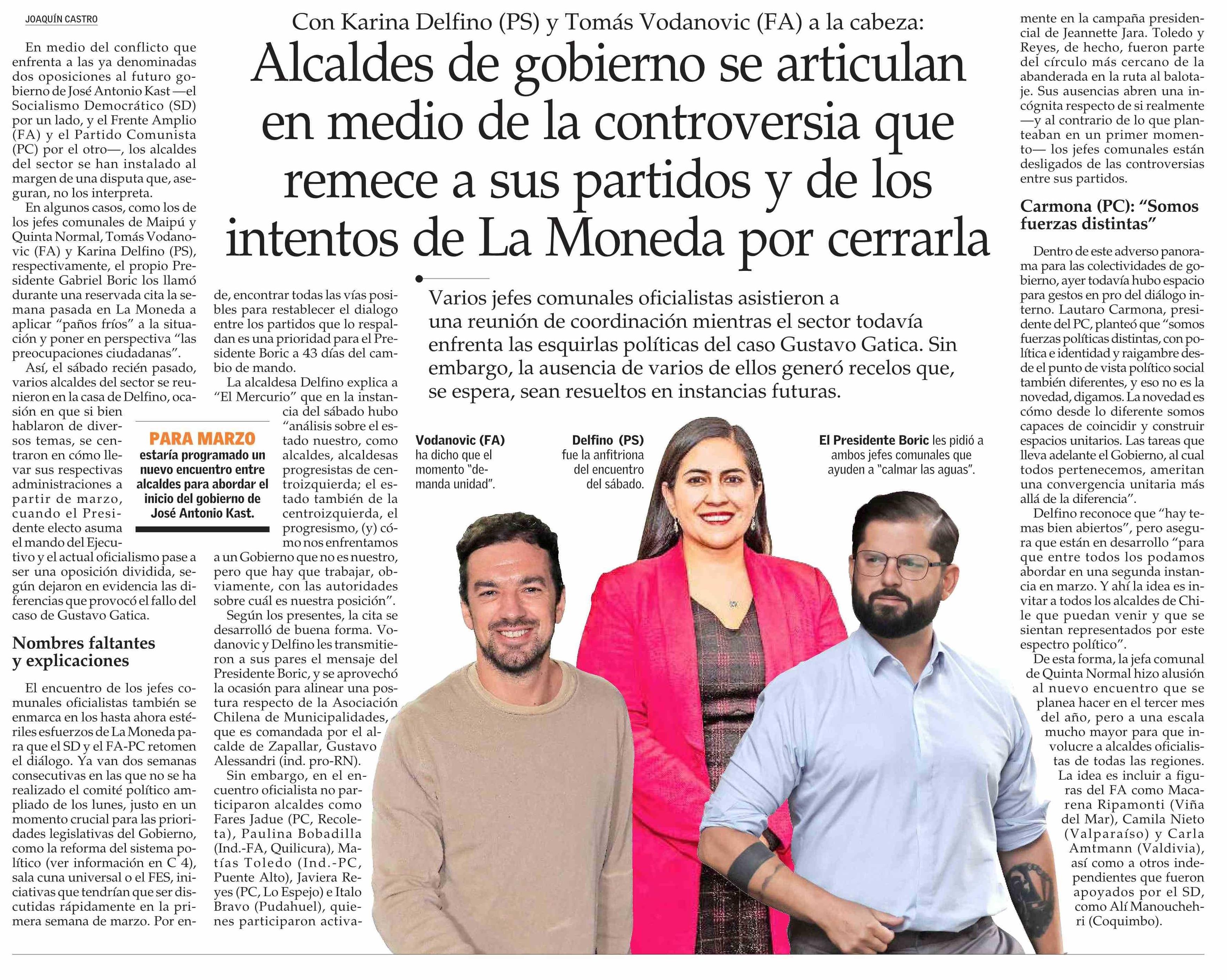 Alcaldes de gobierno se articulan en medio de la controversia que remece a sus partidos y de los intentos de La Moneda por cerrarla 27-01-2026 El Mercurio |
