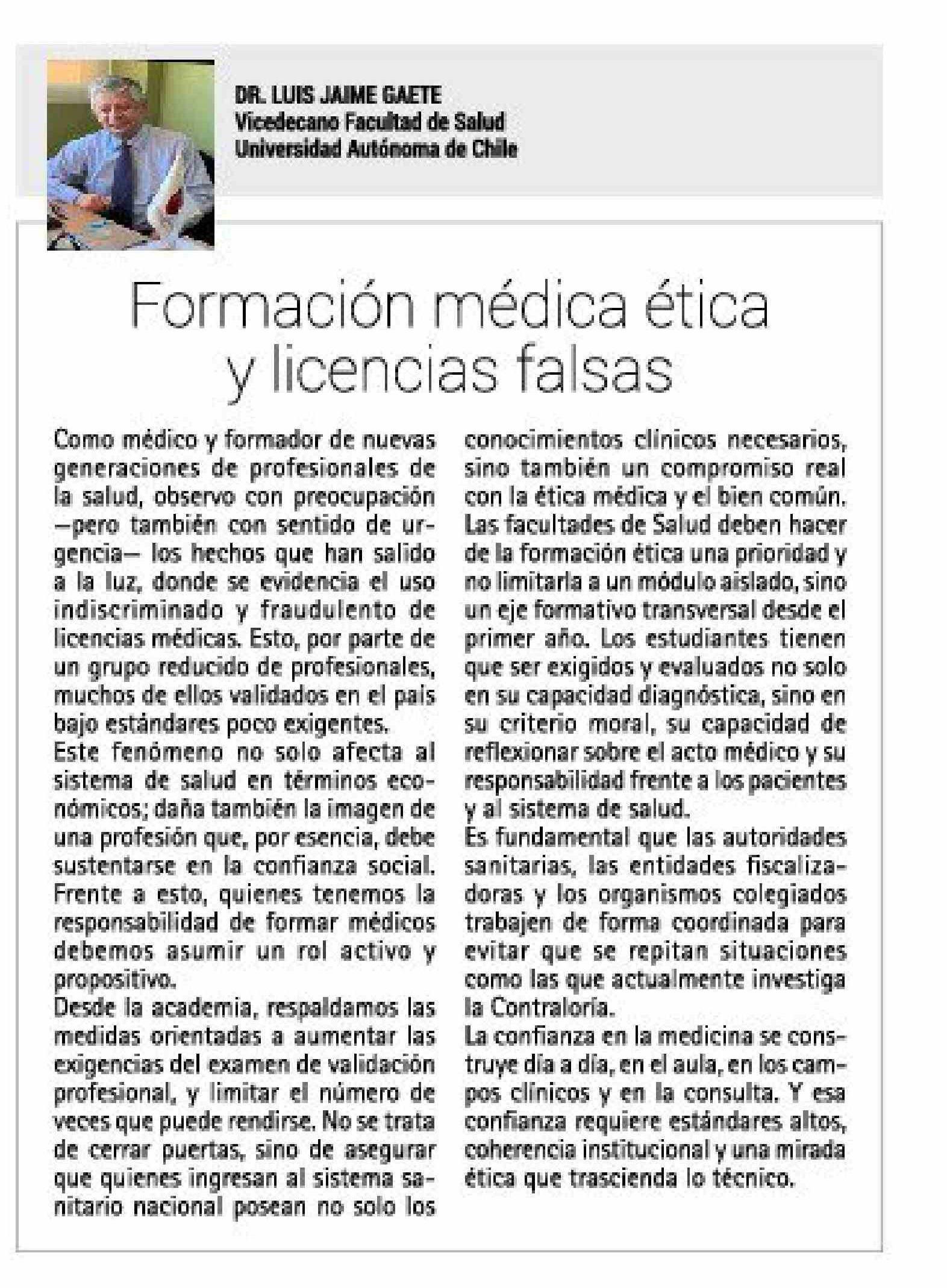 | Título: | Columna de Opinión: Formación médica ética y licencias falsas |