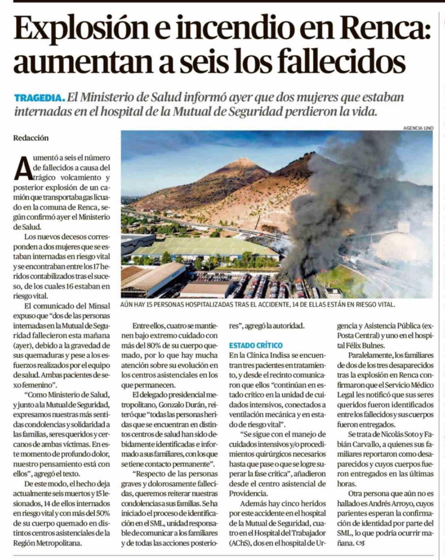 Título: Explosión e incendio en Renca: aumentan a seis los fallecidos