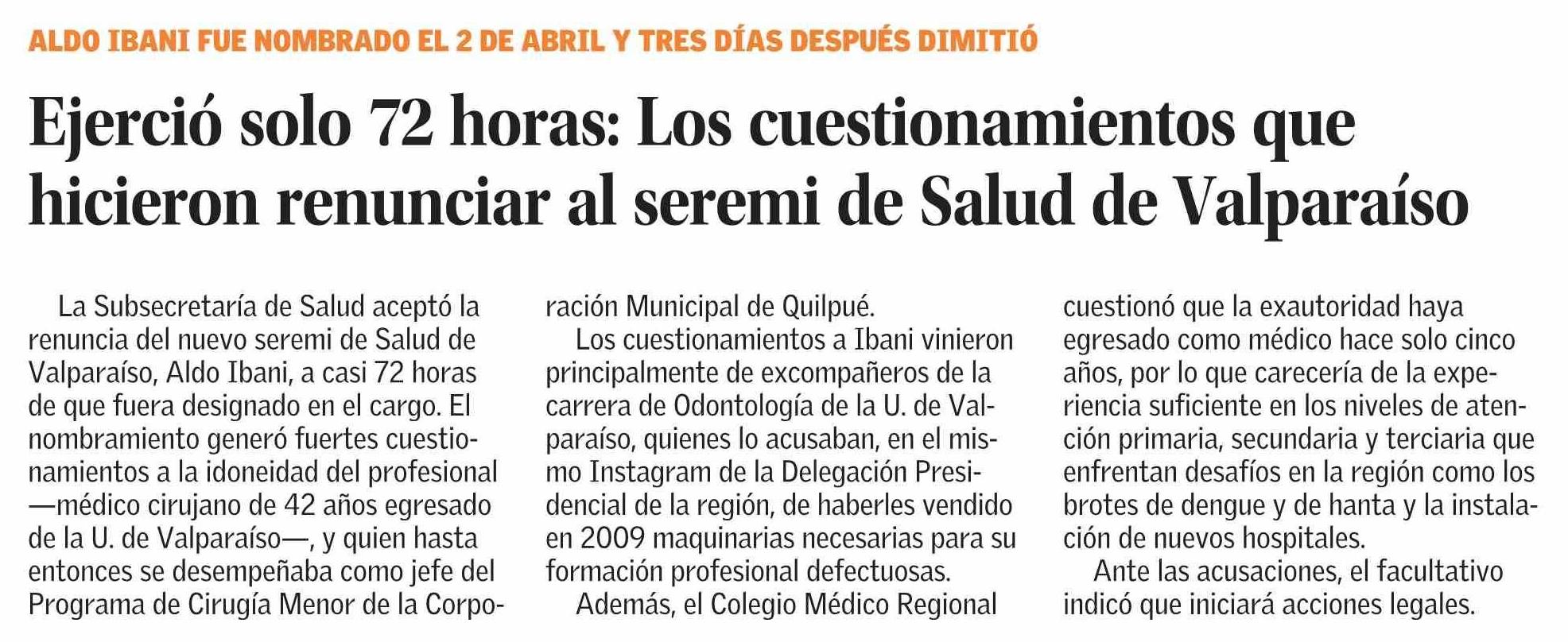 Ejerció solo 72 horas: Los cuestionamientos que hicieron renunciar al seremi de Salud de Valparaíso 07-04-2026 El Mercurio |