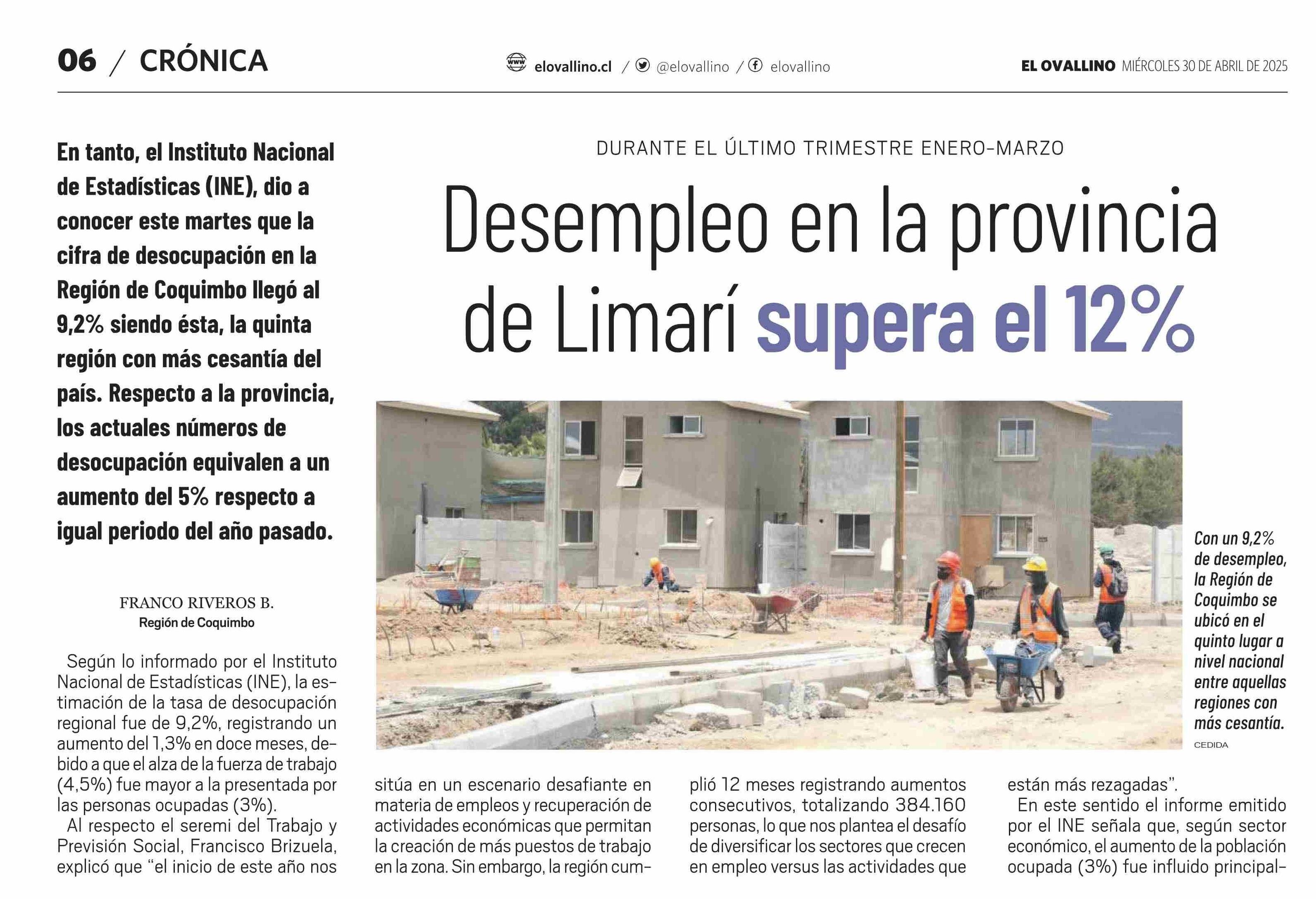 Desempleo en la provincia de Limarí supera el 12% 30-04-2025 El Ovallino |