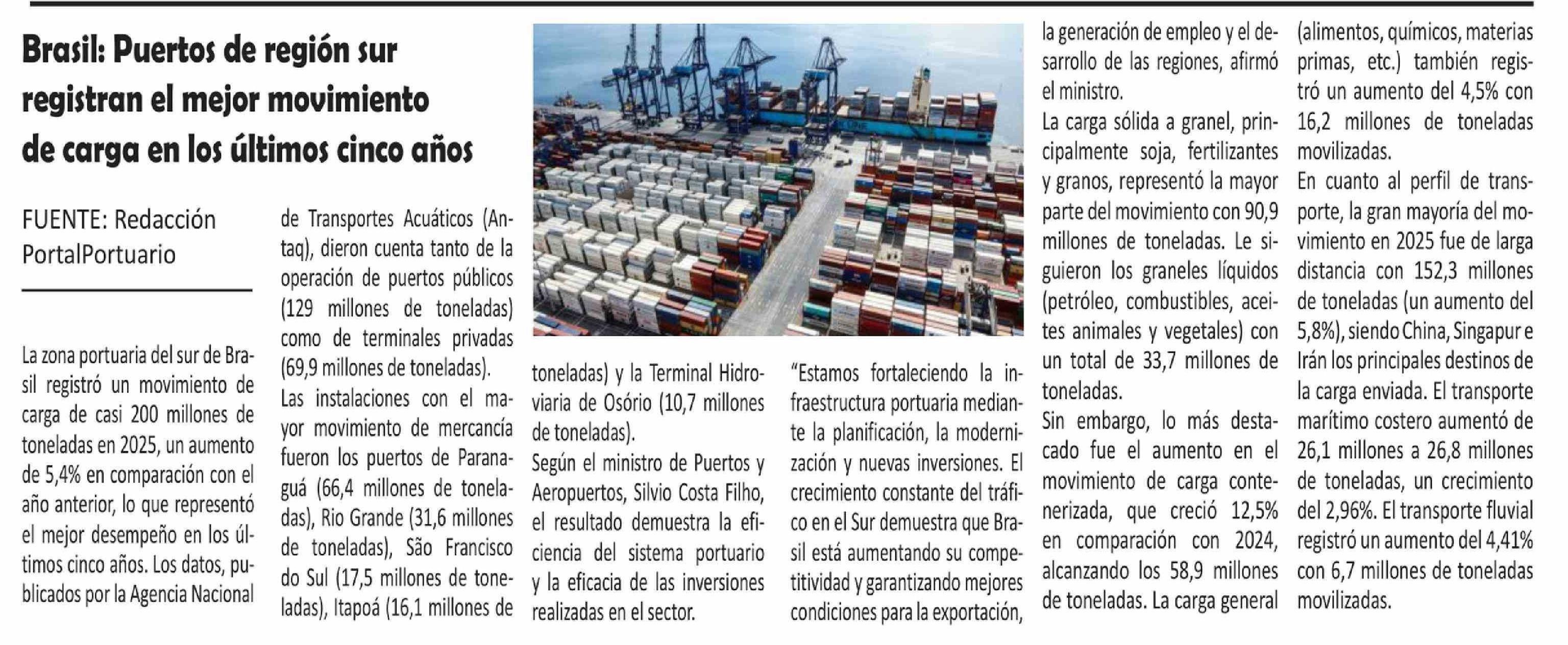 Brasil: Puertos de región sur registran el mejor movimiento de carga en los últimos cinco años 28-02-2026 El Longino |