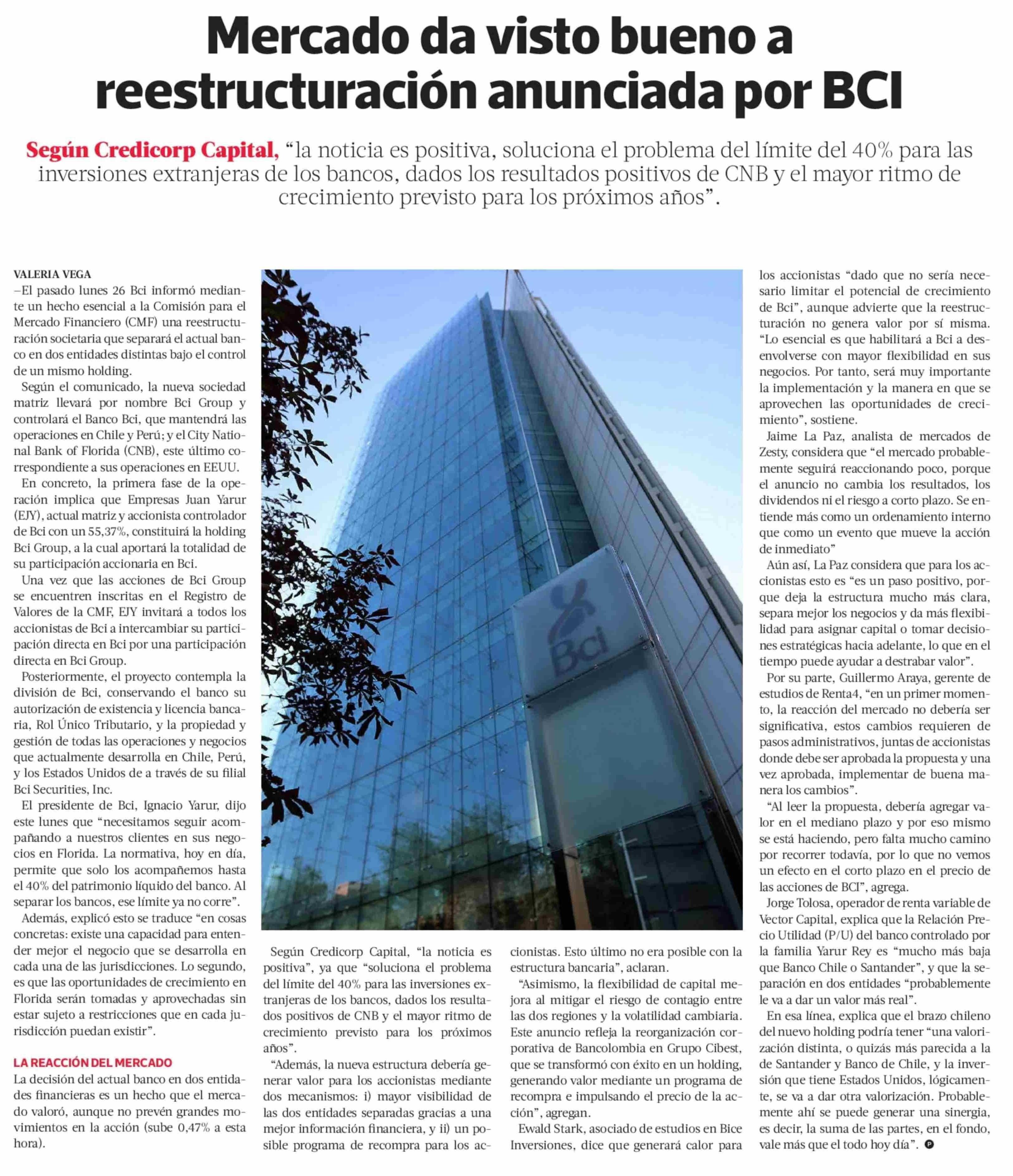 Título: Mercado da visto bueno a reestructuración anunciada por BCI