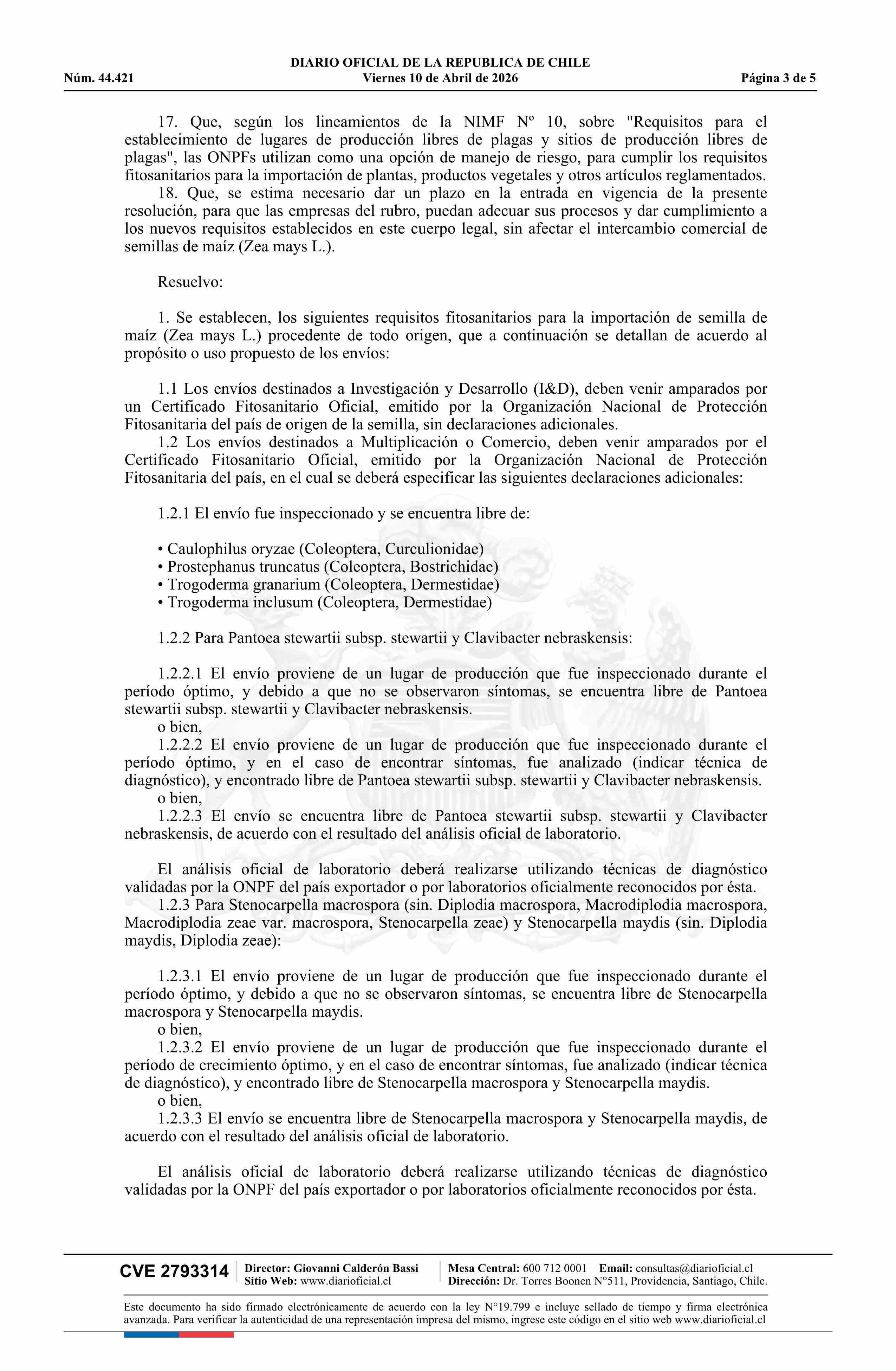 Título: Resolución exenta número 2.554, de 2026.- Establece requisitos fitosanitarios de importación para el ingreso de semillas de maíz (Zea mays L.) procedentes de todo origen y modifica resolución N° 1.187 exenta, de 2022