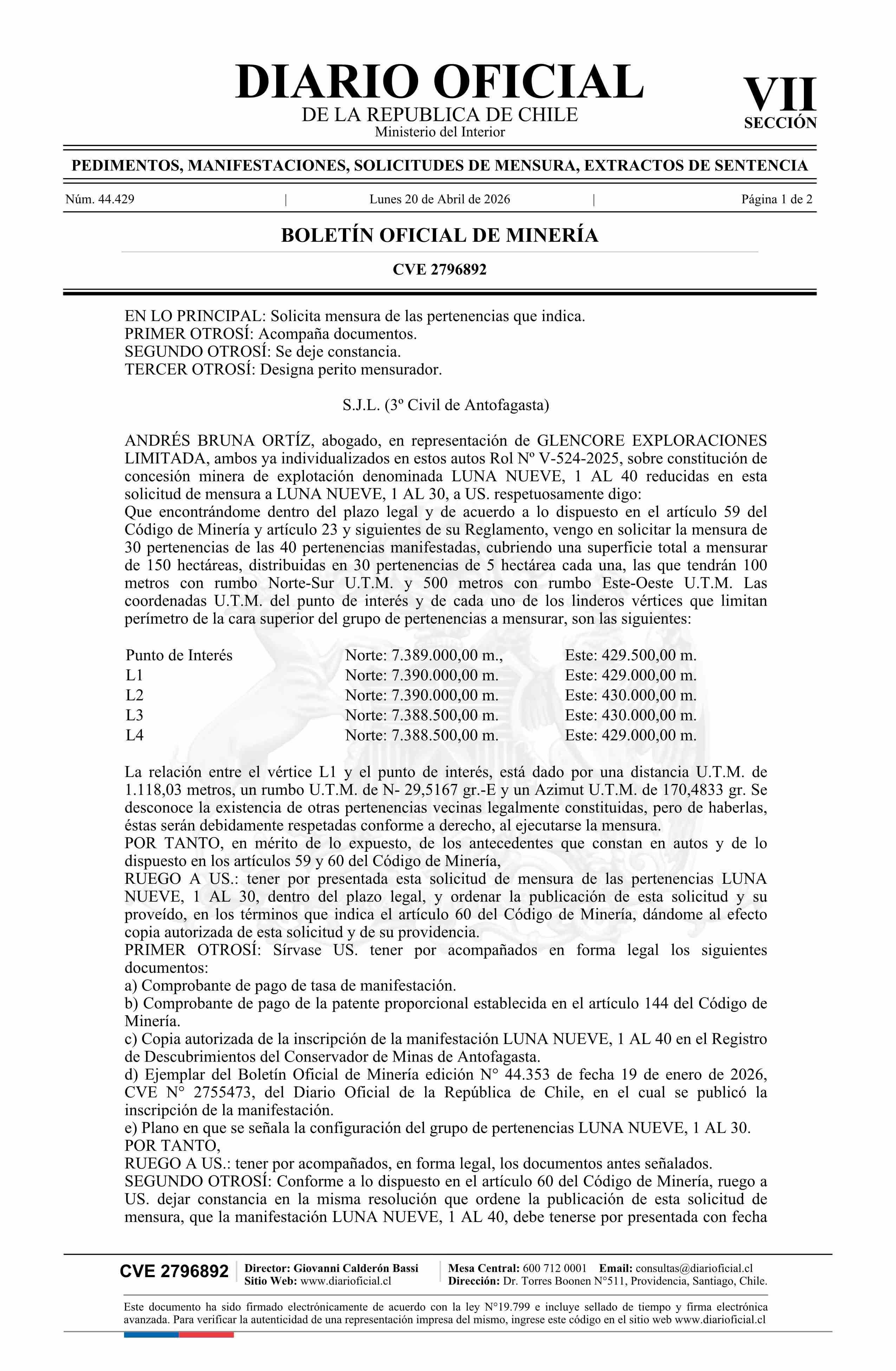 LUNA NUEVE, 1 AL 30 / Glencore Exploraciones Limitada 20-04-2026 DIARIO OFICIAL CHILE - BOLETÍN OFICIAL DE MINERÍA |