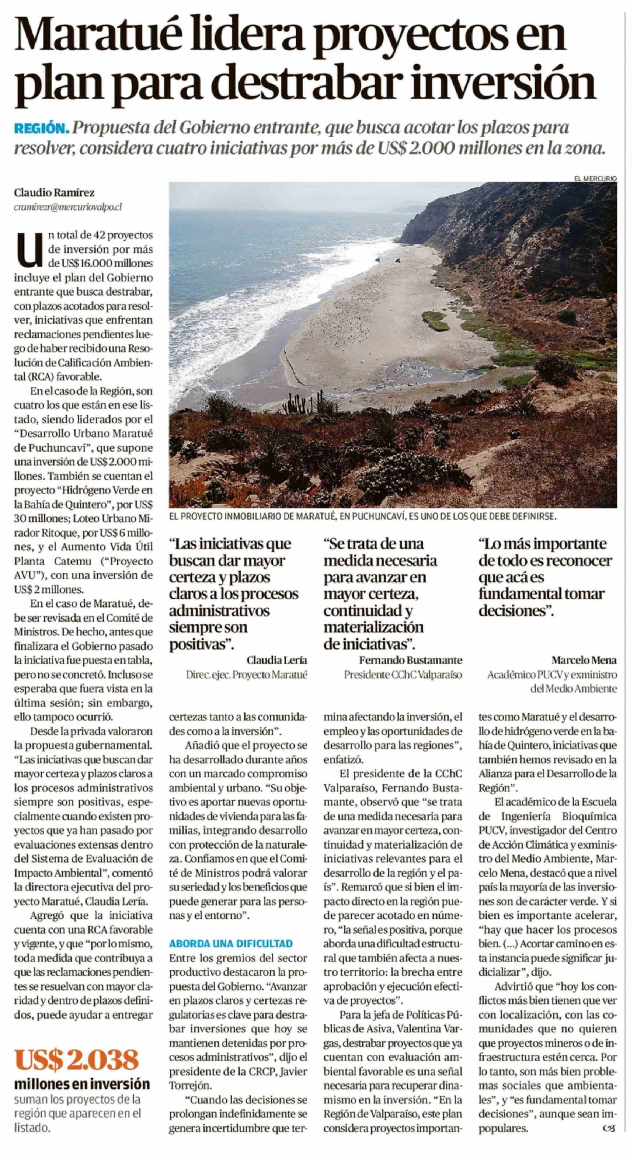 Maratué lidera proyectos en plan para destrabar inversión 14-03-2026 El Mercurio de Valparaíso |
