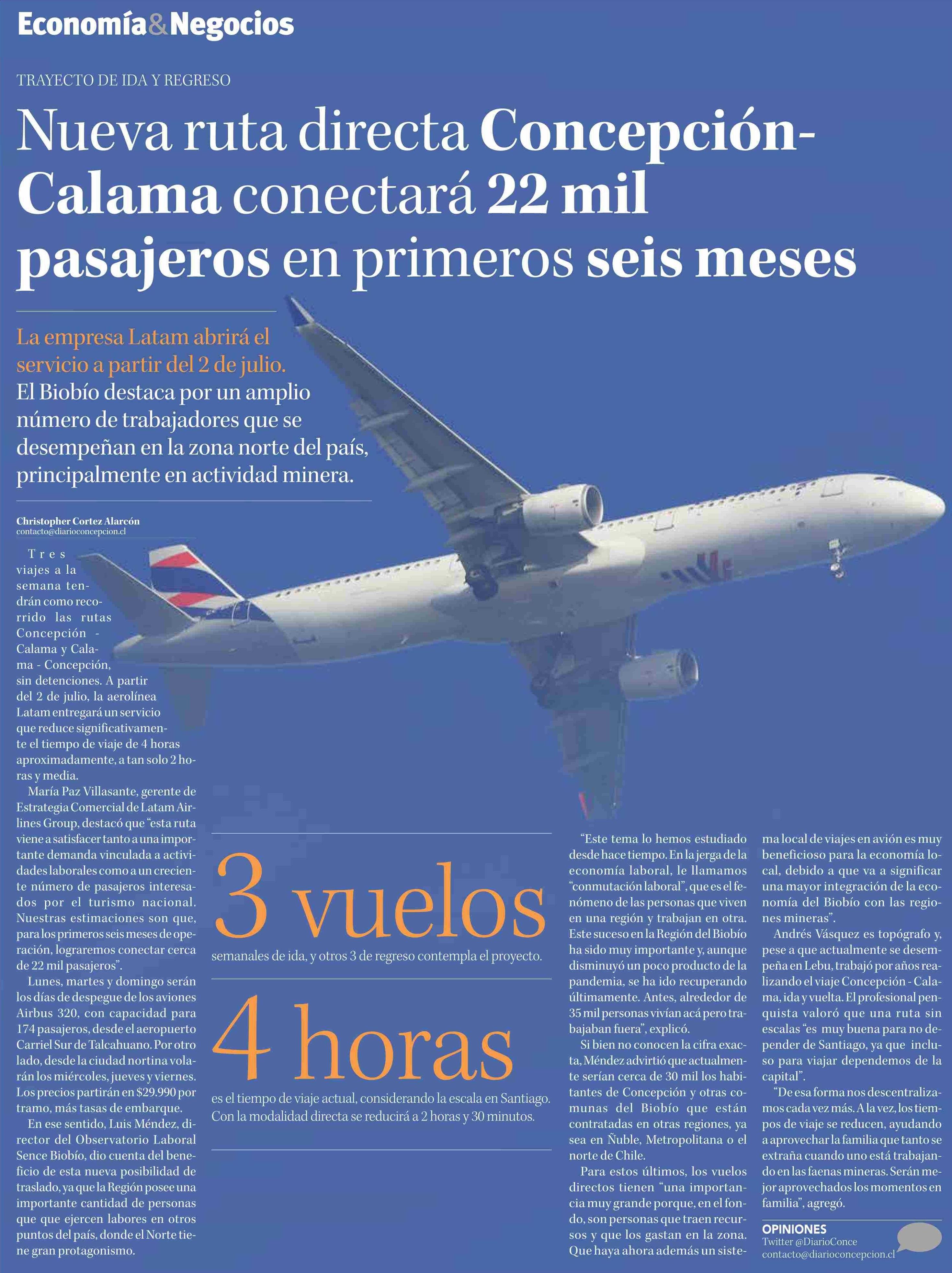 Nueva ruta directa Concepción- Calama conectará 22 mil pasajeros en primeros seis meses 17-05-2023 Diario Concepción |