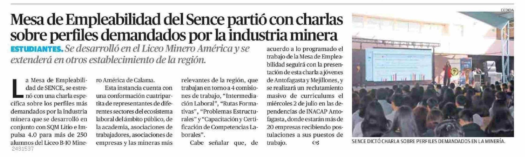 Mesa de Empleabilidad del Sence partió con charlas sobre perfiles demandados por la industria minera 13-06-2025 El Mercurio de Calama |