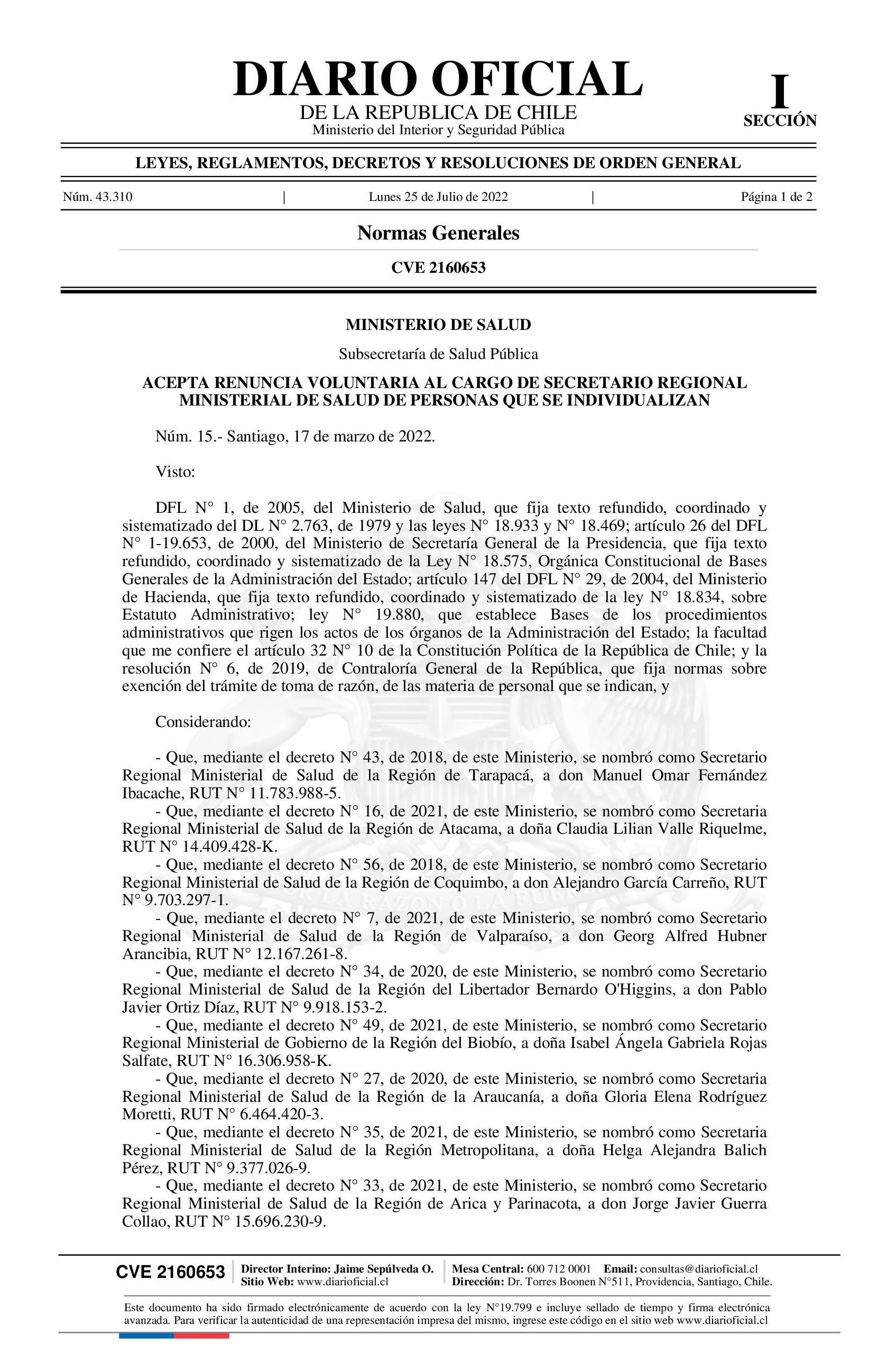 Ministerio de Salud Acepta Renuncia Voluntaria Al Cargo de Secretario Regional Ministerial de Salud de Personas Que Se Individualizan 25-07-2022 Diario Oficial Edición Electrónica |