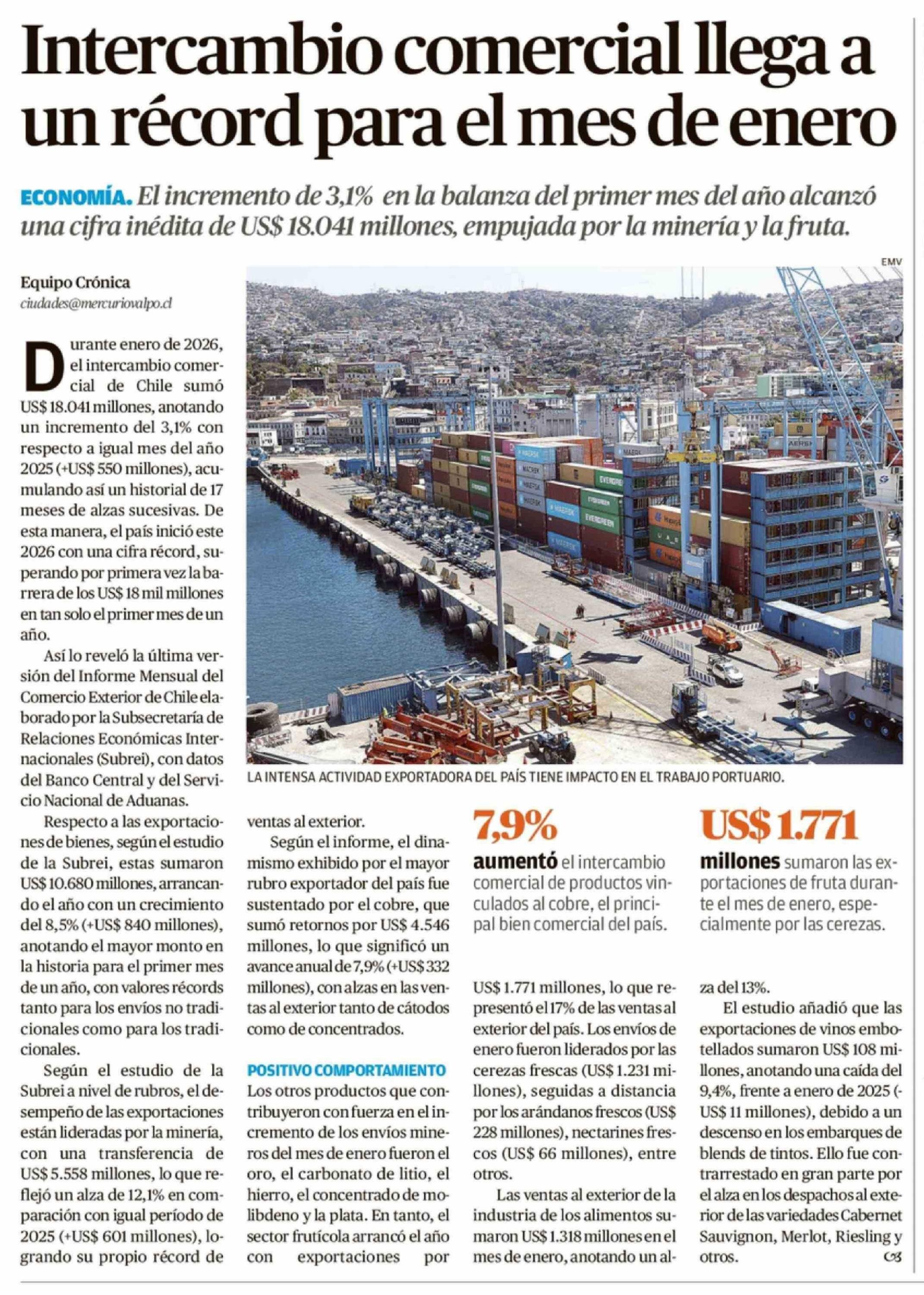 Intercambio comercial llega a un récord para el mes de enero 12-02-2026 El Mercurio de Valparaíso |