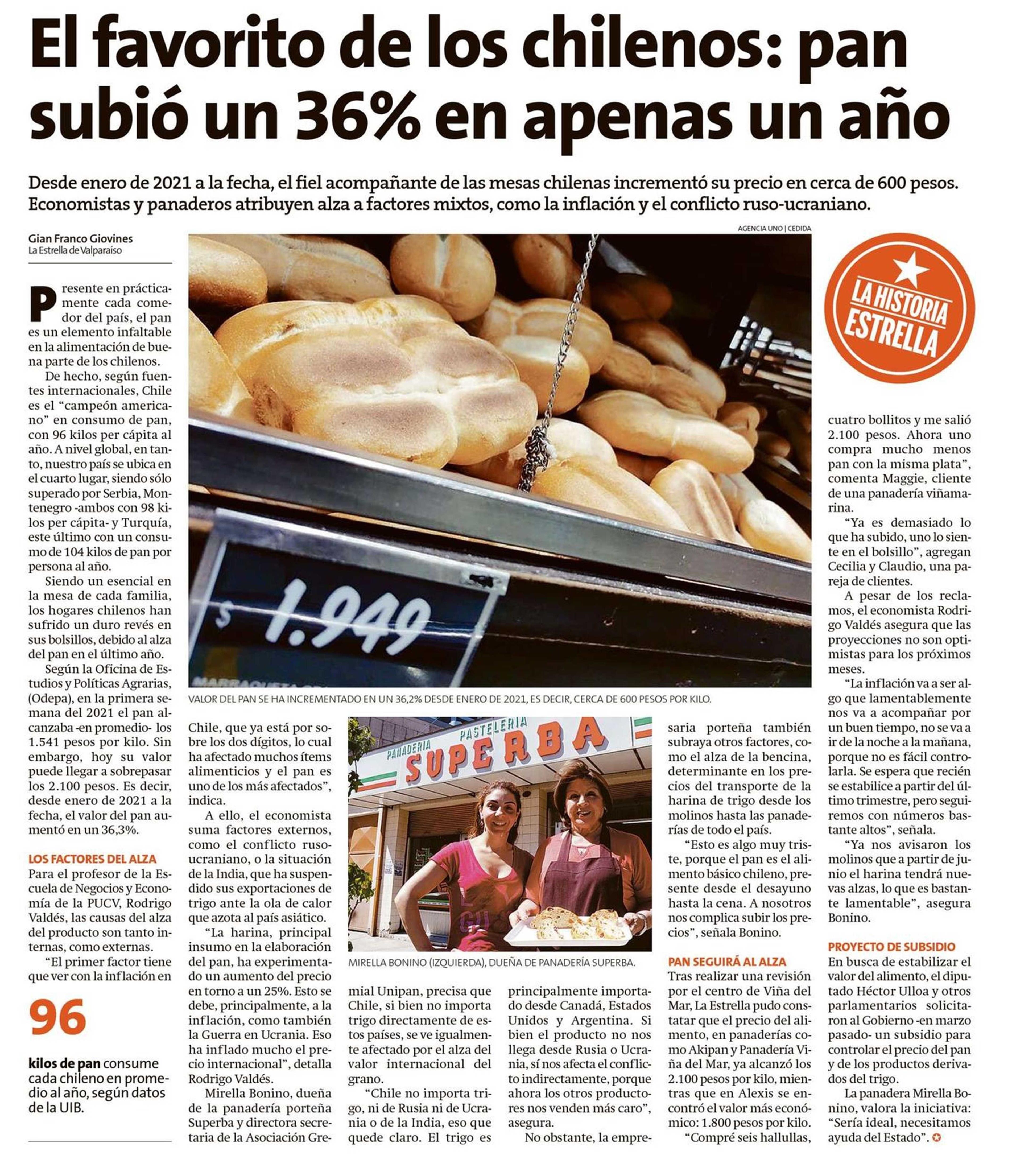 El favorito de los chilenos: pan subió un 36% en apenas un año 26-05-2022 La Estrella de Valparaíso |