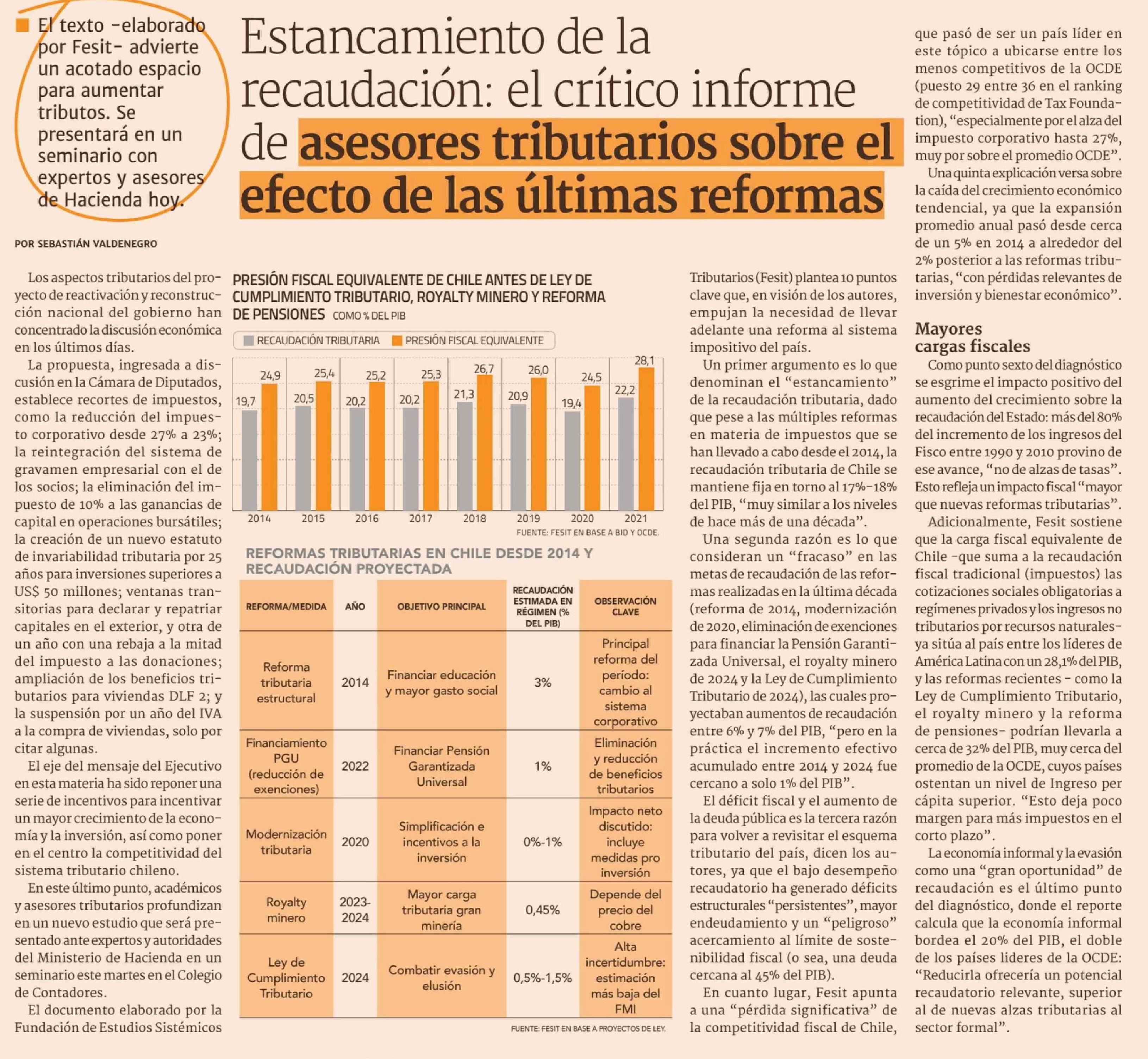 Estancamiento de la recaudación: el crítico informe de asesores tributarios sobre el efecto de las últimas reformas 28-04-2026 Diario Financiero |