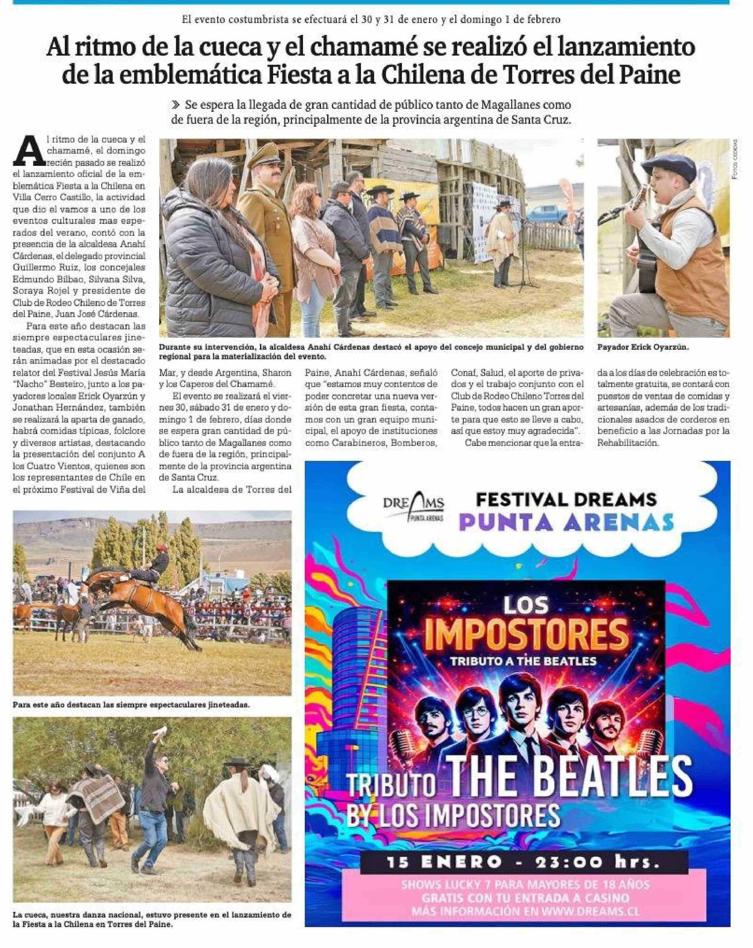 Al ritmo de la cueca y el chamamé se realizó el lanzamiento de la emblemática Fiesta a la Chilena de Torres del Paine 15-01-2026 La Prensa Austral |