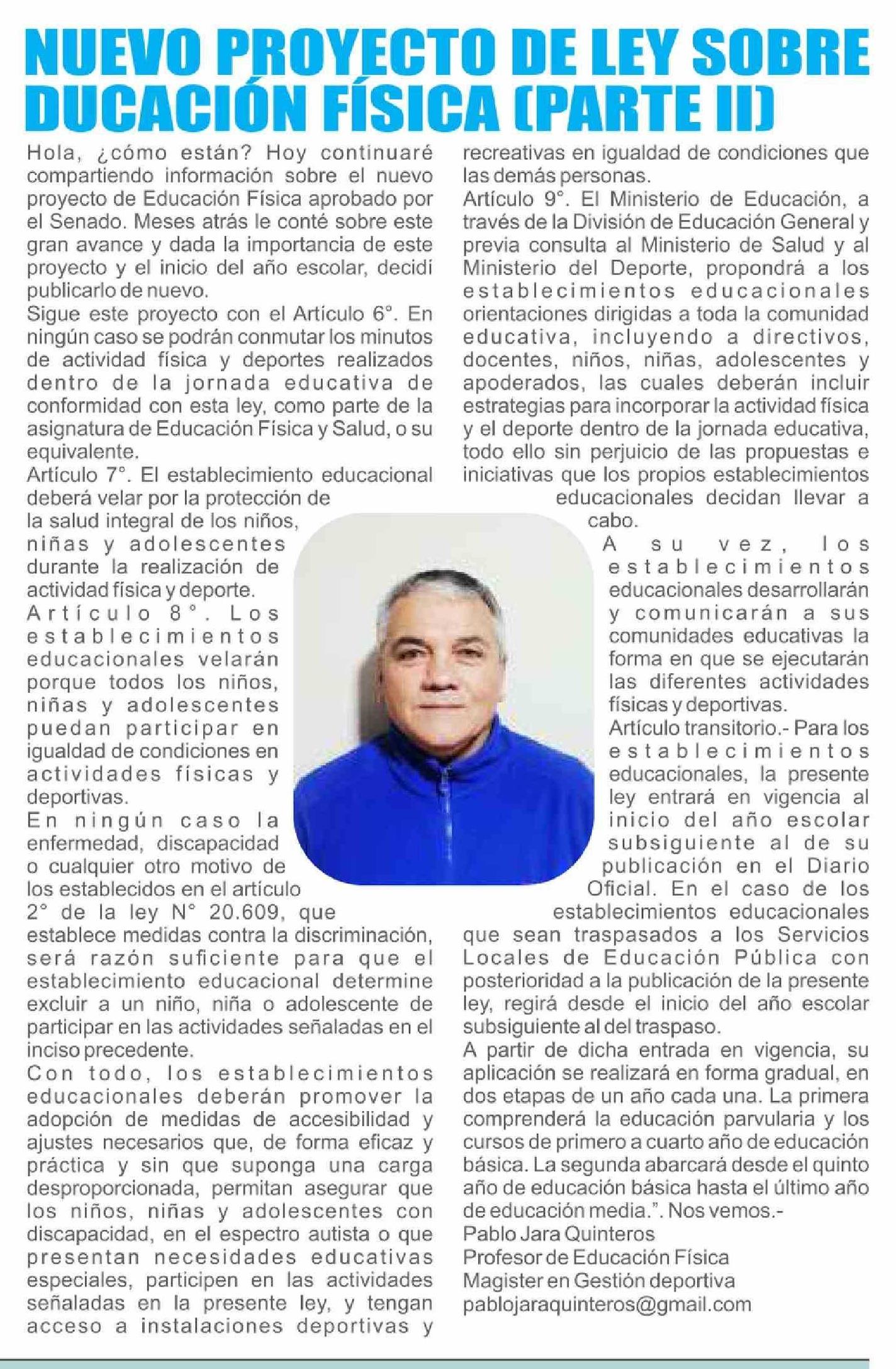 | Título: | Columnas de Opinión: NUEVO PROYECTO DE LEY SOBRE DUCACIÓN FÍSICA (PARTE II) |