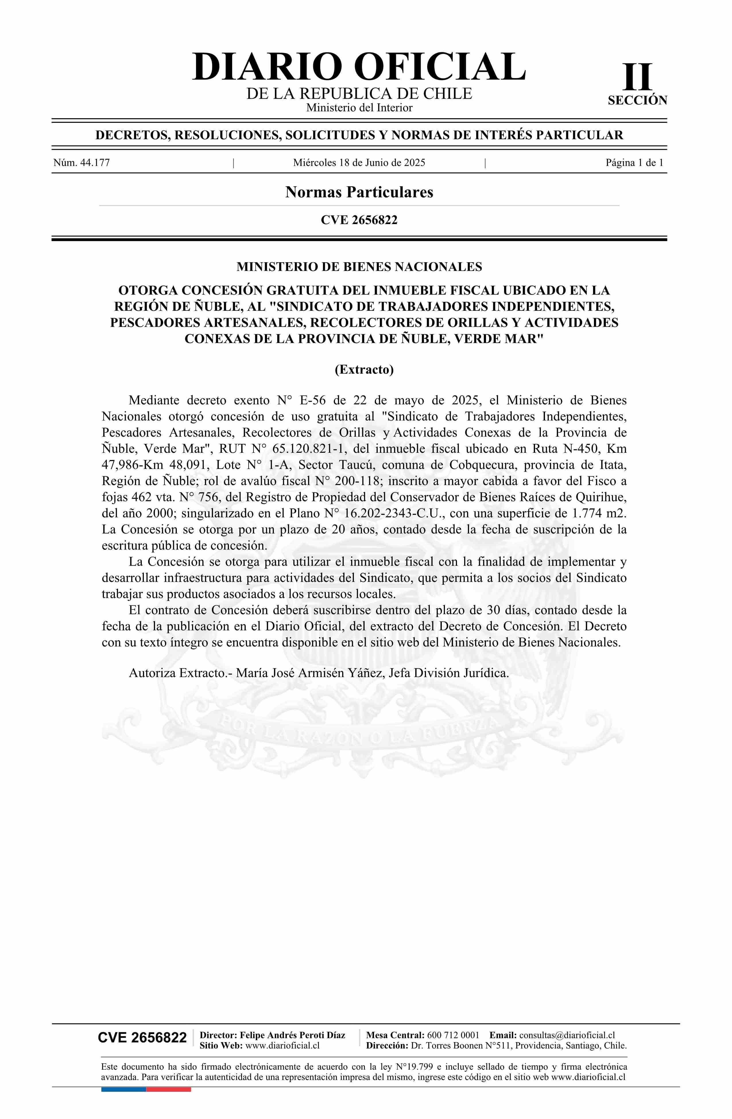| Título: | Extracto de decreto exento número E-56, de 2025.- Otorga concesión gratuita del inmueble fiscal ubicado en la región de Ñuble, al Sindicato de Trabajadores Independientes, Pescadores Artesanales, Recolectores de Orillas y Actividades Conexas de la provincia de Ñuble, Verde Mar |