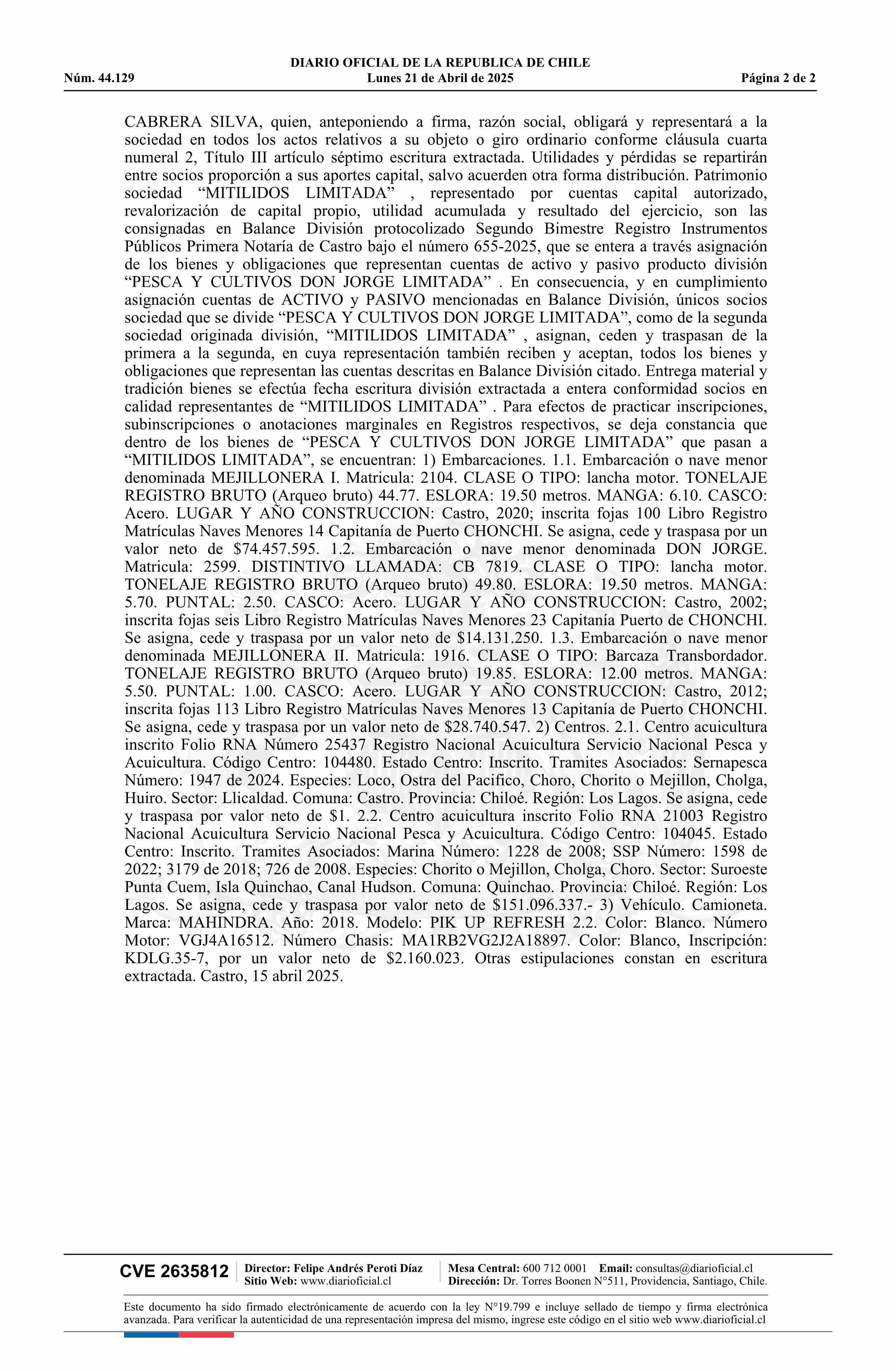 PESCA Y CULTIVOS DON JORGE LIMITADA 79.782.720-7 21-04-2025 Diario Oficial Edición Electrónica |