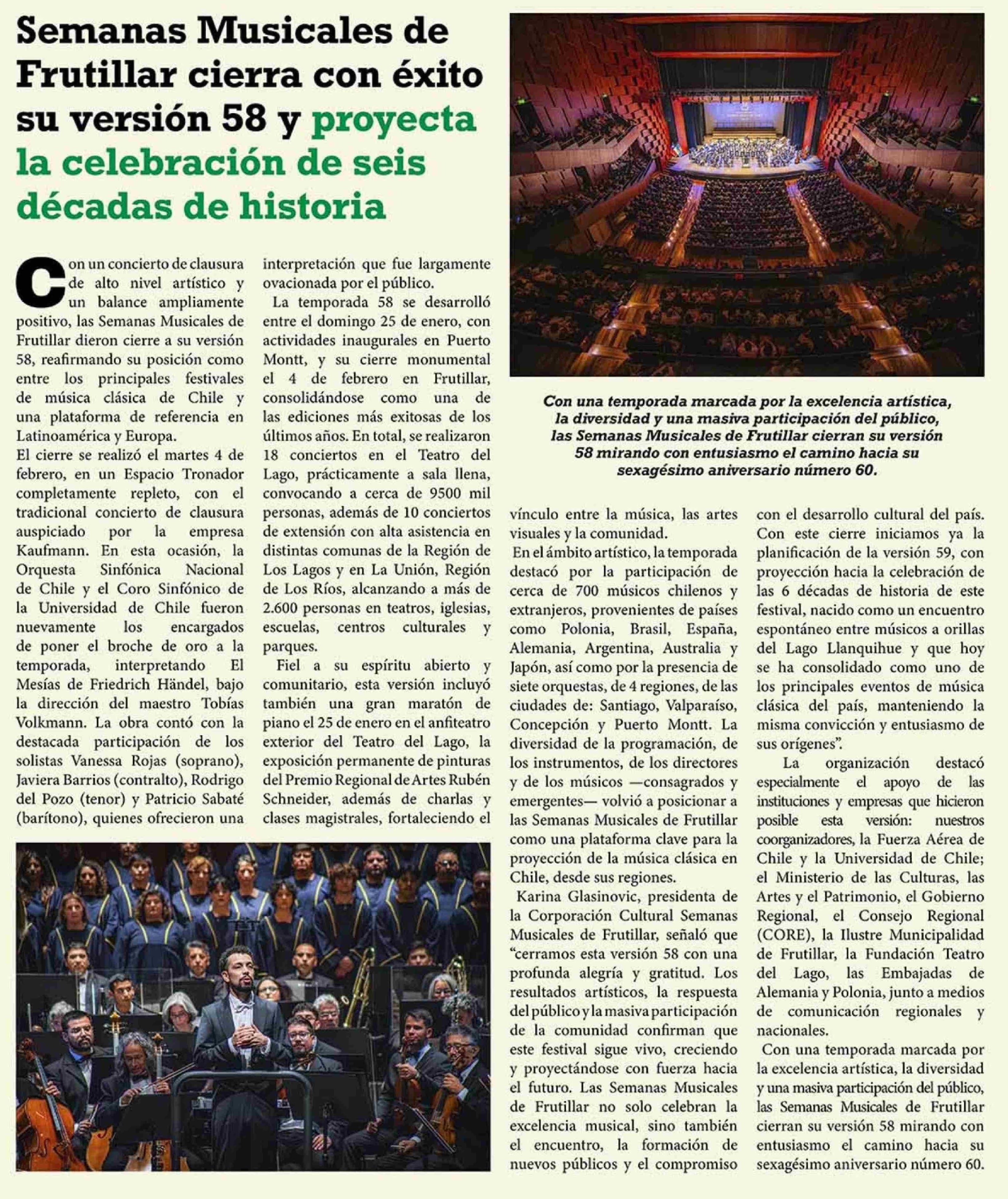 Semanas Musicales de Frutillar cierra con éxito su versión 58 y proyecta la celebración de seis décadas de historia 06-02-2026 El Heraldo Austral |