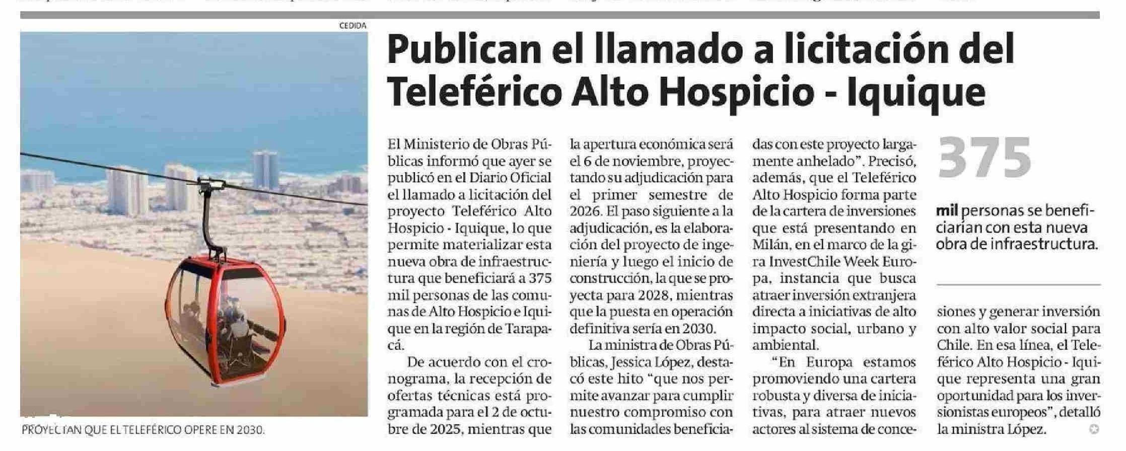 Publican el llamado a licitación del Teleférico Alto Hospicio - Iquique 17-06-2025 La Estrella de Iquique |
