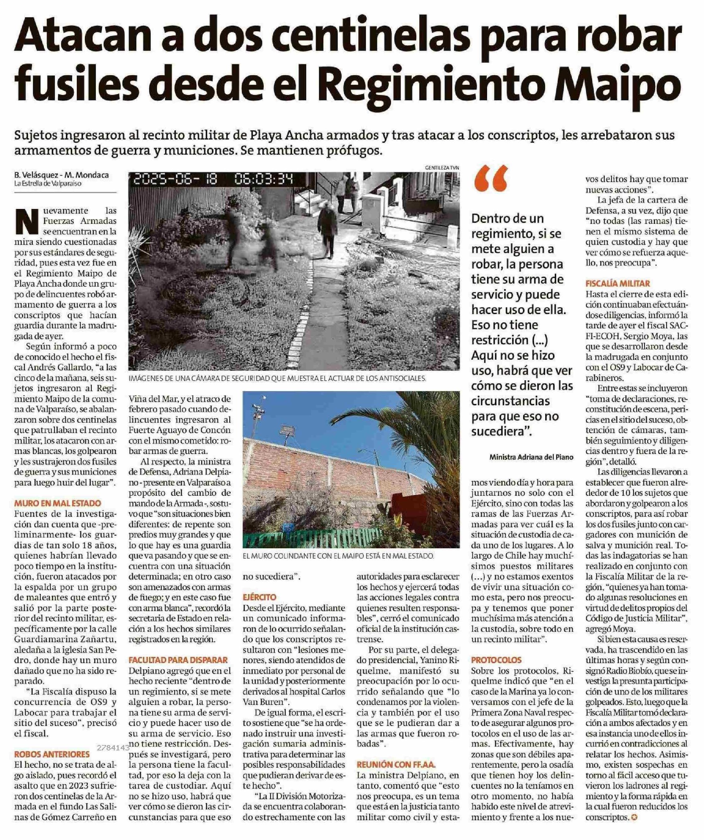 Atacan a dos centinelas para robar fusiles desde el Regimiento Maipo 19-06-2025 La Estrella de Valparaíso |